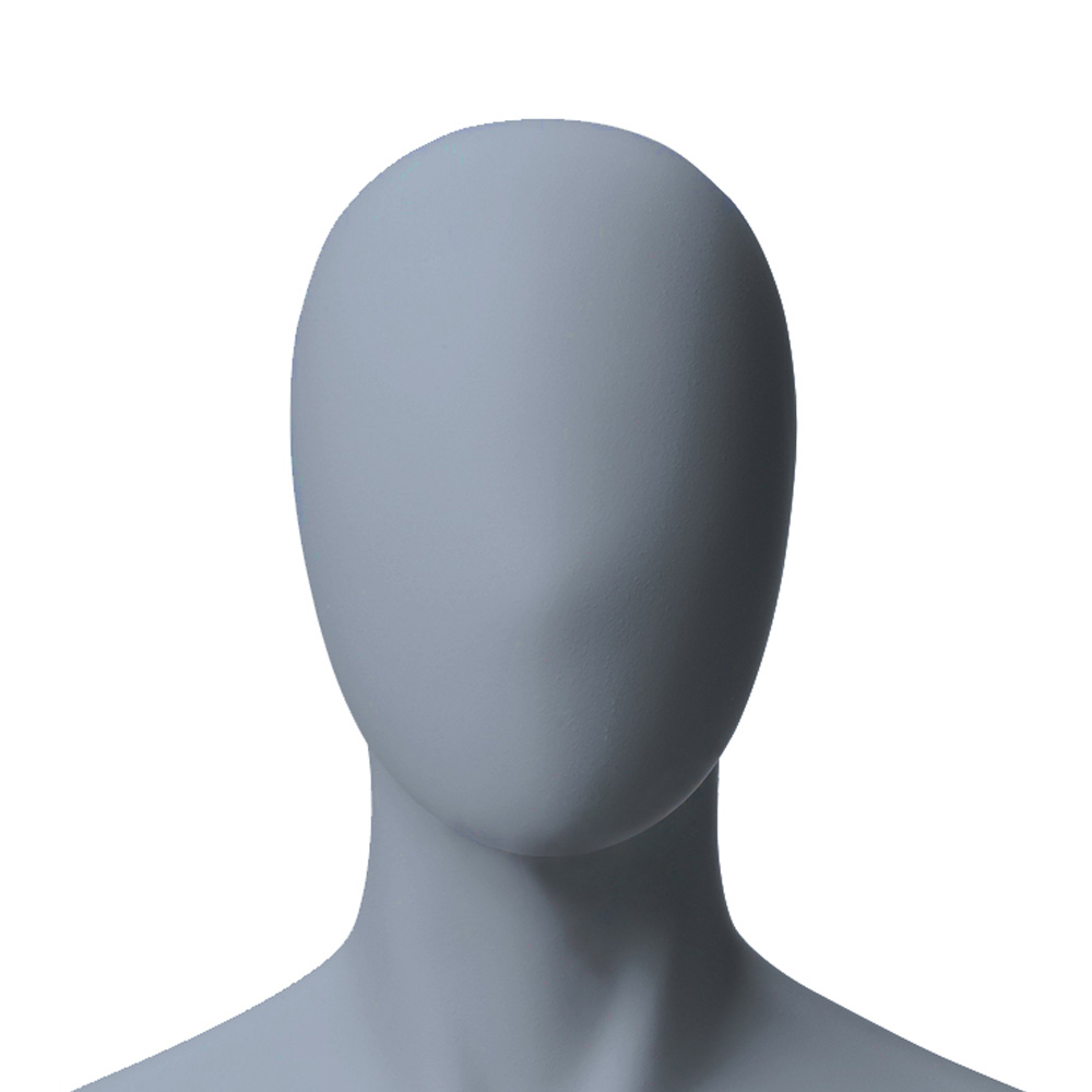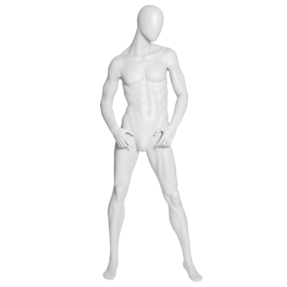 Ανδρική κούκλα βιτρίνας της σειράς Tough Raw Male Collection σε όρθια στάση με τα χέρια πάνω από τους μηρούς με λυγισμένα δάχτυλα και πόδια σε διάσταση. Το κεφάλι είναι αυγοειδές (χωρίς καθόλου χαρακτηριστικά προσώπου) και κοιτάζει αριστερά και κάτω. Είναι κατασκευασμένη από Fiberglass (λεπτές ίνες γυαλιού) ένα υλικό με μεγάλη αντοχή και μικρό βάρος.