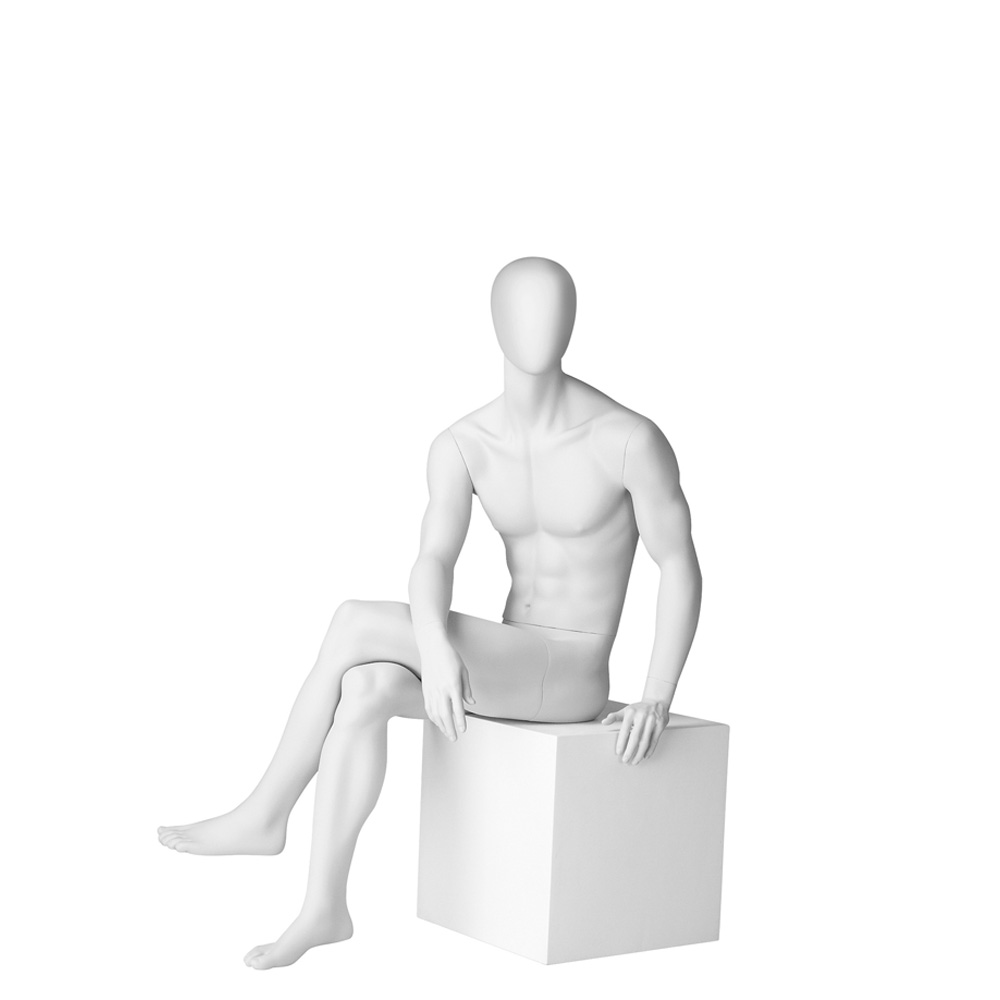 Ανδρική κούκλα βιτρίνας της σειράς Club Class Male Collection σε καθιστή στάση με κορμό στραμένο προς τα αραστερά, αριστερό χέρι ακουμπάει στο κάθισμα και δεξί στον αριστερό μηρό, αριστερό πόδι πάνω από το δεξί (σταυροπόδι). Το κεφάλι είναι αυγοειδές (χωρίς καθόλου χαρακτηριστικά προσώπου) και κοιτάζει ευθεία. Είναι κατασκευασμένη από Fiberglass (λεπτές ίνες γυαλιού) ένα υλικό με μεγάλη αντοχή και μικρό βάρος.