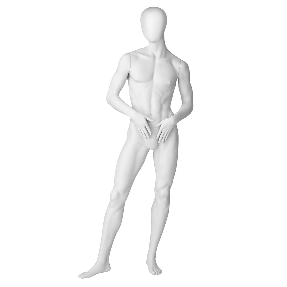 Ανδρική κούκλα βιτρίνας της σειράς Downtown Guys Abstract Collection σε όρθια στάση με τους αγκώνες λυγισμένους και τις παλάμες μπροστά από την κοιλιά, πόδια σε μικρή διάσταση. Το κεφάλι είναι αυγοειδές (χωρίς καθόλου χαρακτηριστικά προσώπου) και κοιτάζει ελαφρώς αριστερά. Είναι κατασκευασμένη από Fiberglass (λεπτές ίνες γυαλιού) ένα υλικό με μεγάλη αντοχή και μικρό βάρος.
