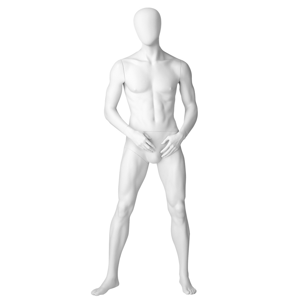Ανδρική κούκλα βιτρίνας της σειράς Downtown Guys Collection σε όρθια στάση με τους αγκώνες λυγισμένους και τις παλάμες πάνω από τους μηρούς, πόδια σε διάσταση. Το κεφάλι είναι αυγοειδές (χωρίς καθόλου χαρακτηριστικά προσώπου) και κοιτάζει ελαφρώς αριστερά. Είναι κατασκευασμένη από Fiberglass (λεπτές ίνες γυαλιού) ένα υλικό με μεγάλη αντοχή και μικρό βάρος.