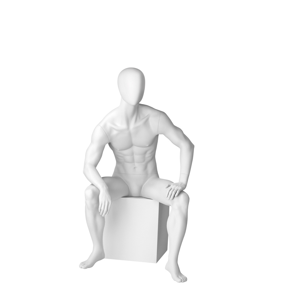Ανδρική κούκλα βιτρίνας της σειράς Downtown Guys Collection σε καθιστή στάση με δεξί πήχη στο δεξί γόνατο και αριστερό χέρι να ακουμπάει το αριστερό γόνατο. Το κεφάλι είναι αυγοειδές (χωρίς καθόλου χαρακτηριστικά προσώπου) και κοιτάζει ελαφρώς αριστερά. Είναι κατασκευασμένη από Fiberglass (λεπτές ίνες γυαλιού) ένα υλικό με μεγάλη αντοχή και μικρό βάρος.