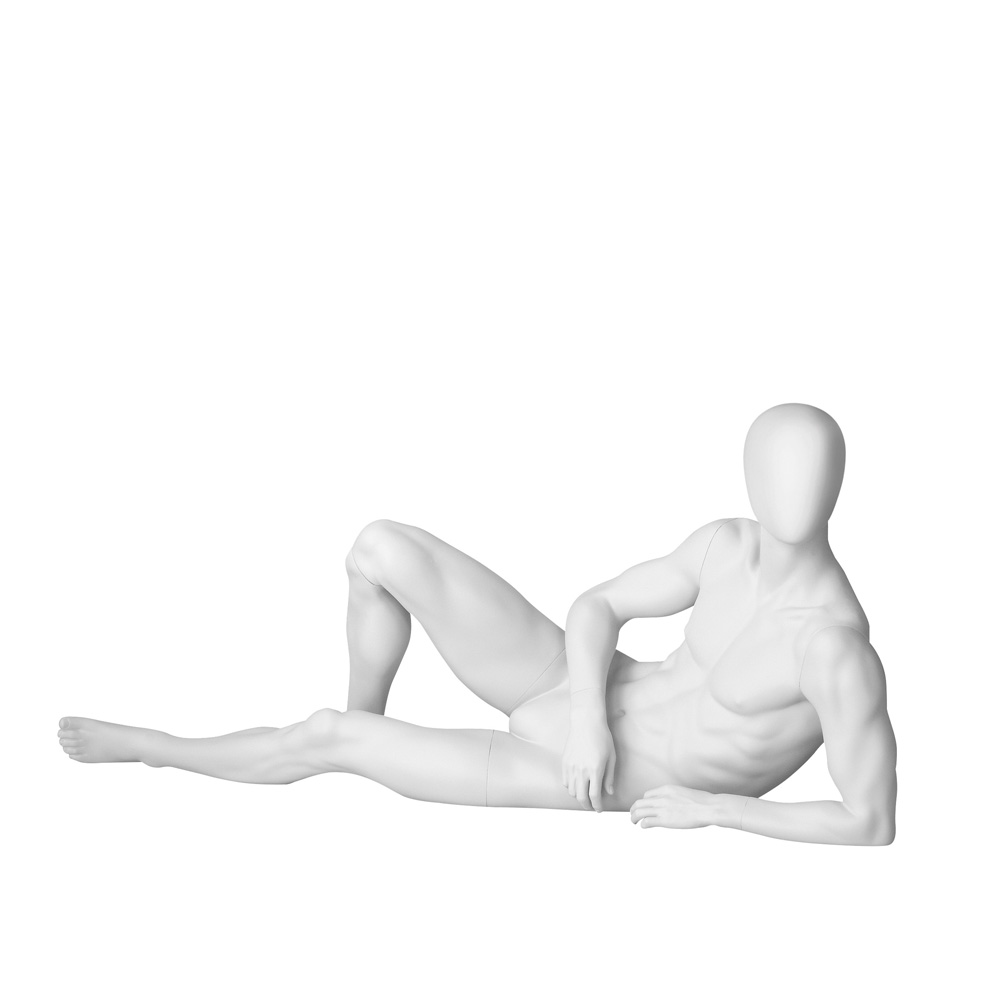 Ανδρική κούκλα βιτρίνας της σειράς Downtown Guys Collection σε ξαπλωτή στάση με αριστερό πήχη στο έδαφος και δεξί γόνατο λυγισμένο. Το κεφάλι είναι αυγοειδές (χωρίς καθόλου χαρακτηριστικά προσώπου) και κοιτάζει αριστερά. Είναι κατασκευασμένη από Fiberglass (λεπτές ίνες γυαλιού) ένα υλικό με μεγάλη αντοχή και μικρό βάρος.