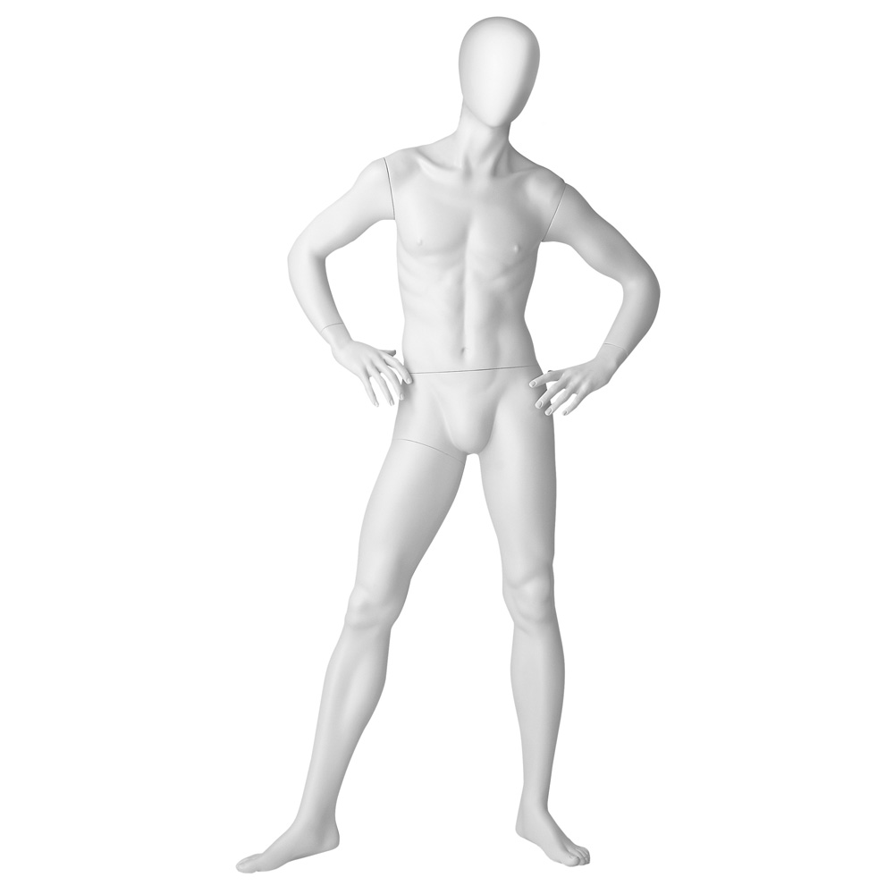 Ανδρική κούκλα βιτρίνας της σειράς Youth Club Boys Collection σε όρθια στάση με τα χέρια στη μέση και πόδια σε μικρή διάσταση. Το κεφάλι είναι αφαιρετικό αυγοειδές (χωρίς καθόλου χαρακτηριστικά προσώπου) και κοιτάζει ευθεία. Είναι κατασκευασμένη από Fiberglass (λεπτές ίνες γυαλιού) ένα υλικό με μεγάλη αντοχή και μικρό βάρος.
