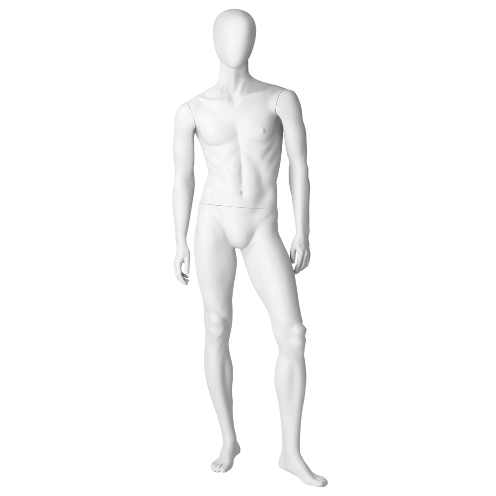 Ανδρική κούκλα βιτρίνας της σειράς Youth Club Boys Abstract Collection σε όρθια στάση με τα χέρια κάτω, αριστερό γόνατο ελαφρώς λυγισμένο. Το κεφάλι είναι αφαιρετικό αυγοειδές (χωρίς καθόλου χαρακτηριστικά προσώπου) και κοιτάζει ευθεία. Είναι κατασκευασμένη από Fiberglass (λεπτές ίνες γυαλιού) ένα υλικό με μεγάλη αντοχή και μικρό βάρος.