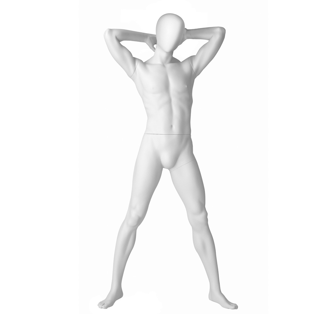 Ανδρική κούκλα βιτρίνας της σειράς Youth Club Boys Abstract Collection σε όρθια στάση με τα χέρια πίσω από το κεφάλι και πόδια σε διάσταση. Το κεφάλι είναι αφαιρετικό αυγοειδές (χωρίς καθόλου χαρακτηριστικά προσώπου) και κοιτάζει ευθεία. Είναι κατασκευασμένη από Fiberglass (λεπτές ίνες γυαλιού) ένα υλικό με μεγάλη αντοχή και μικρό βάρος.