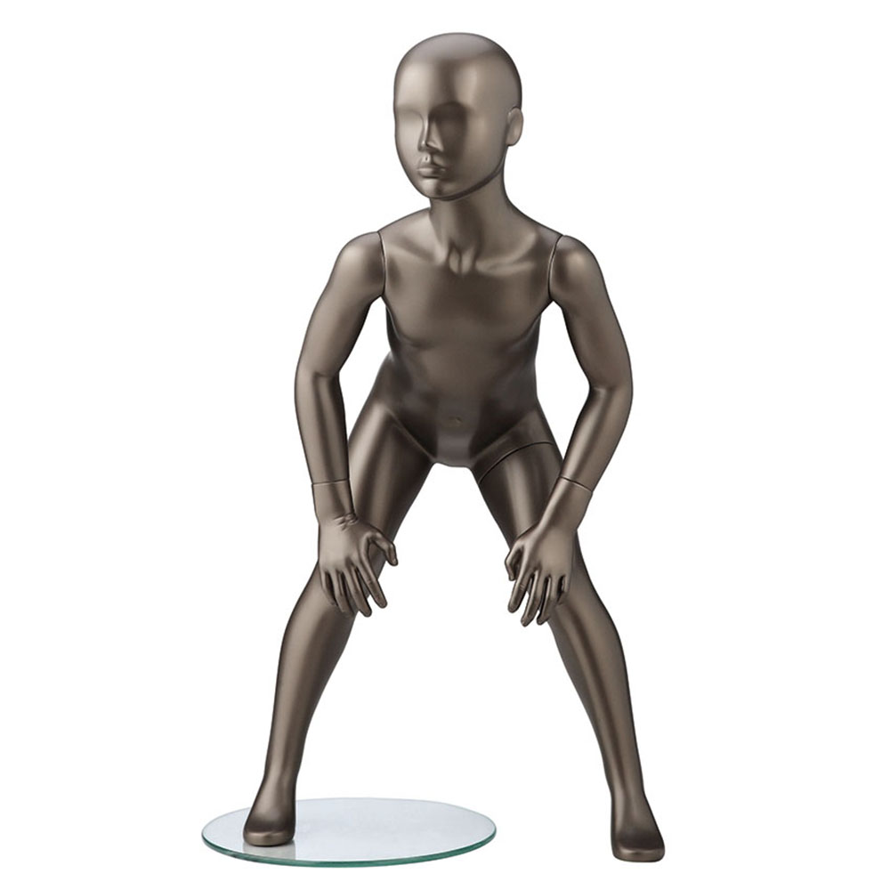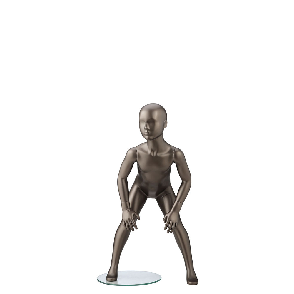 Παιδική κούκλα βιτρίνας 4 Χρονών της σειράς Retro Kids Collection σε σκυφτή στάση το κεφάλι κοιτάει ελαφρώς δεξιά, χέρια στα γόνατα, γόνατα ελαφρώς λυγισμένα. Είναι κατασκευασμένη από Fiberglass (λεπτές ίνες γυαλιού) ένα υλικό με μεγάλη αντοχή και μικρό βάρος.