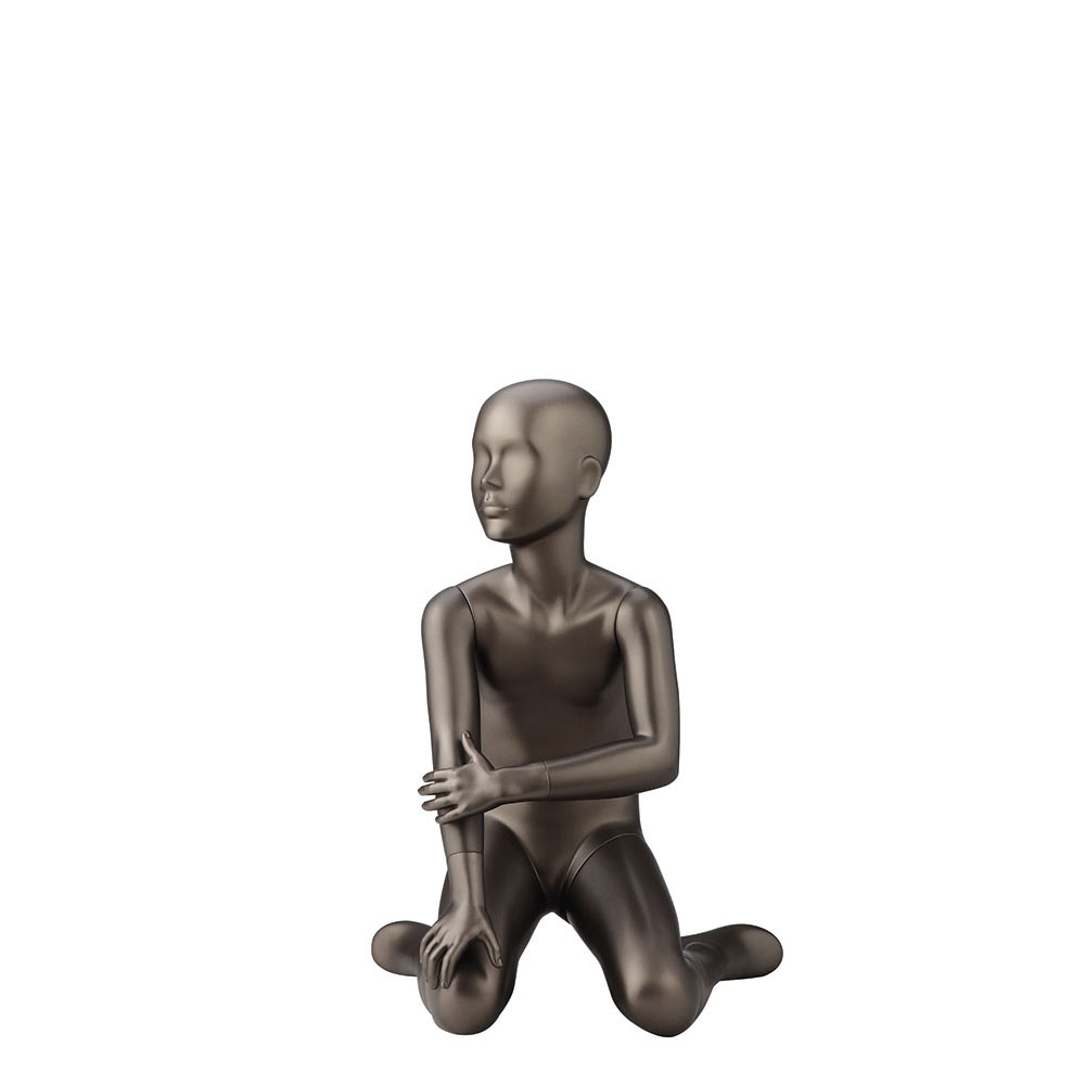 Παιδική κούκλα βιτρίνας 8 Χρονών της σειράς Retro Kids Collection σε καθιστή (στα γόνατα) στάση το κεφάλι αριστερά, αριστερό χέρι πιάνει το δεξιό αγκώνα. Είναι κατασκευασμένη από Fiberglass (λεπτές ίνες γυαλιού) ένα υλικό με μεγάλη αντοχή και μικρό βάρος.
