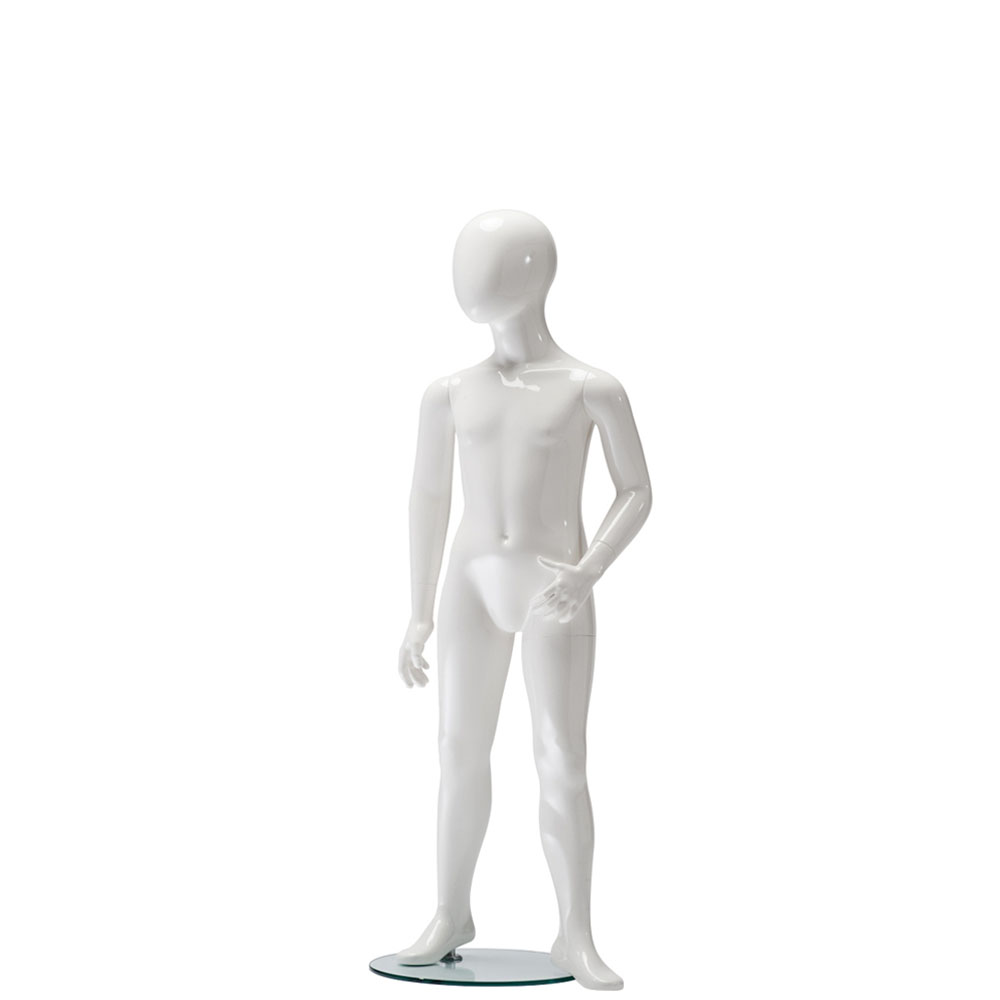 Παιδική κούκλα βιτρίνας 6 Χρονών της σειράς Ringo Kids Collection σε όρθια στάση, το κεφάλι (αφαιρετικό χωρίς καθόλου χαρακτηριστικά προσώπου) κοιτάει δεξιά, αριστερός αγκώνας λυγισμένος (τα χέρια μπορούν να προσαρμοστούν στο ύψος που θέλετε), πόδια σε μικρή διάσταση. Είναι κατασκευασμένη από Fiberglass (λεπτές ίνες γυαλιού - ένα υλικό με μεγάλη αντοχή και μικρό βάρος).