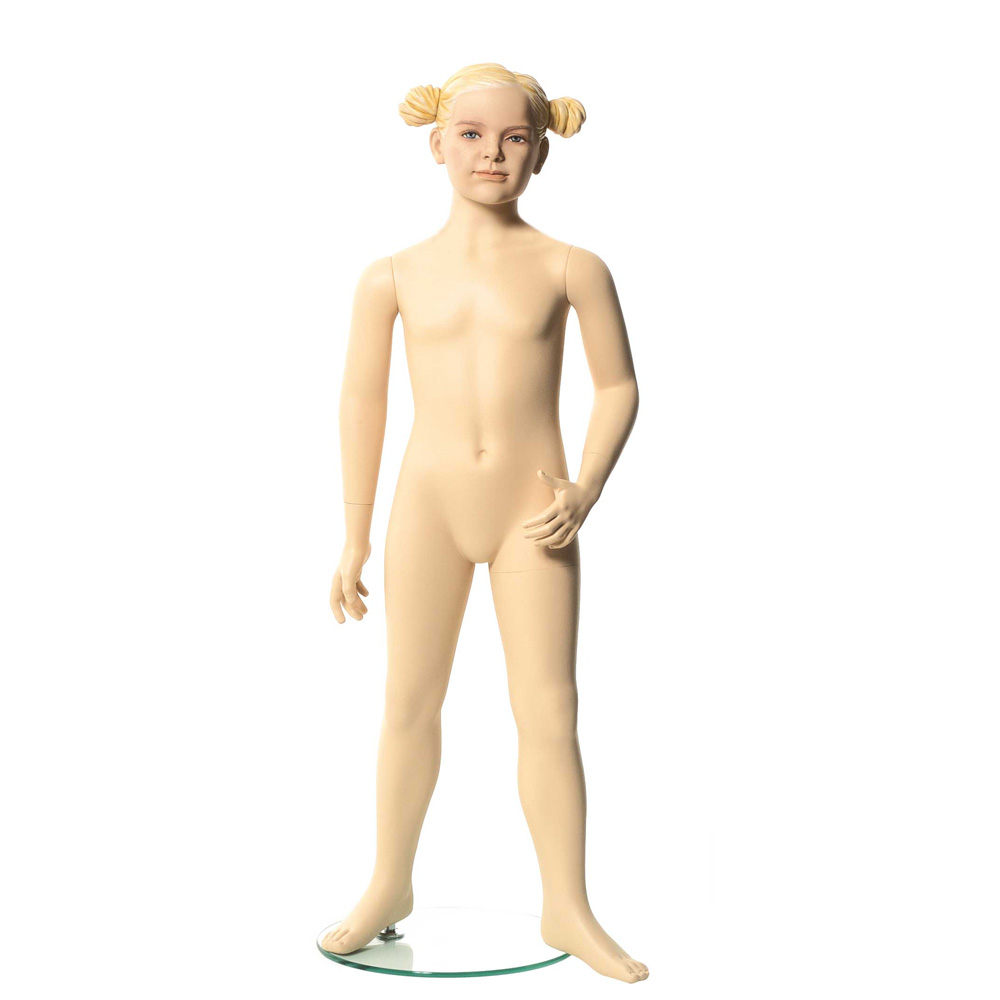 Παιδική κούκλα βιτρίνας 6 Χρονών της σειράς Q Kids Collection σε όρθια στάση, το κεφάλι κοιτάει ευθεία, αριστερός αγκώνας λυγισμένος (τα χέρια μπορούν να προσαρμοστούν στο ύψος που θέλετε) και πόδια ίσια. Είναι κατασκευασμένη από Fiberglass (λεπτές ίνες γυαλιού - ένα υλικό με μεγάλη αντοχή και μικρό βάρος).