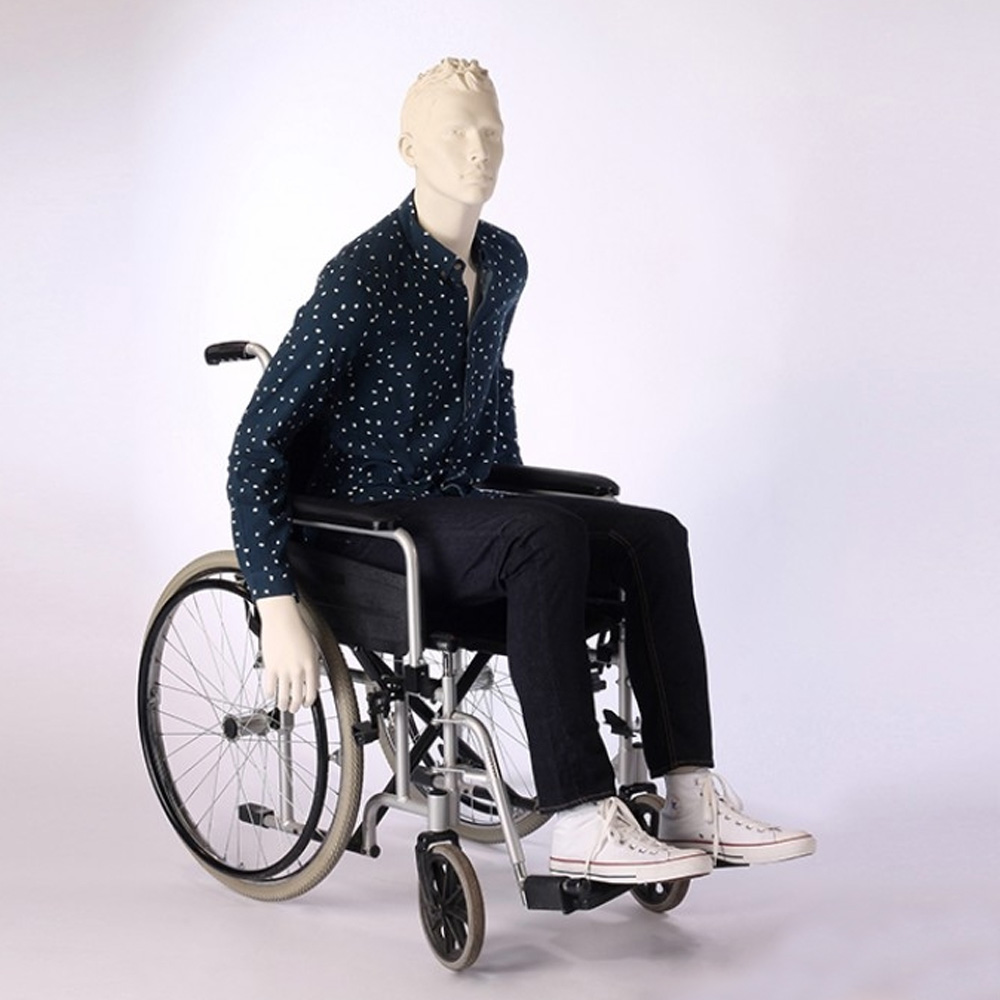 Κούκλα βιτρίνας ανδρική της σειράς Orthοpedic Collection σε καθιστή στάση για προβολή αναπηρικού αμαξιδίου.
