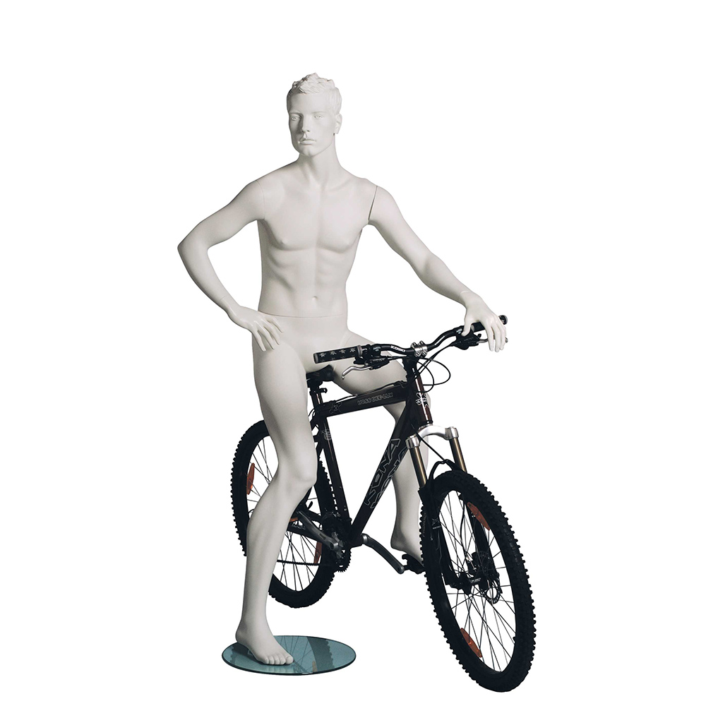 Αθλητική κούκλα βιτρίνας της σειράς Kevin σε καθιστή στάση. To κεφάλι είναι ρεαλιστικό με ανάγλυφο μαλλί (με λεπτομέρειες προσώπου) και κοιτάει ελαφρώς δεξιά, δεξί χέρι στη μέση και αριστερό κρατάει το τιμόνι, δεξί πόδι κάτω και αριστερό στο πεντάλ (στάση ποδηλάτη). Είναι κατασκευασμένη από Fiberglass (λεπτές ίνες γυαλιού) ένα υλικό με μεγάλη αντοχή και μικρό βάρος.