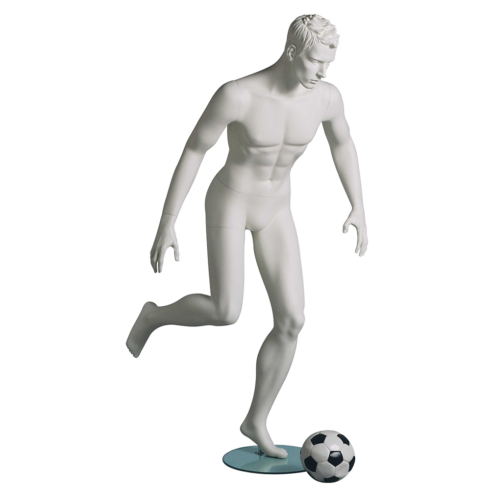 Αθλητική κούκλα βιτρίνας της σειράς Kevin σε όρθια στάση. To κεφάλι είναι ρεαλιστικό με ανάγλυφο μαλλί (με λεπτομέρειες προσώπου) και κοιτάει κάτω, χέρια ελαφρώς ανοιχτά, γόνατα λυγισμένα (στάση ποδοσφαιριστή). Είναι κατασκευασμένη από Fiberglass (λεπτές ίνες γυαλιού) ένα υλικό με μεγάλη αντοχή και μικρό βάρος.