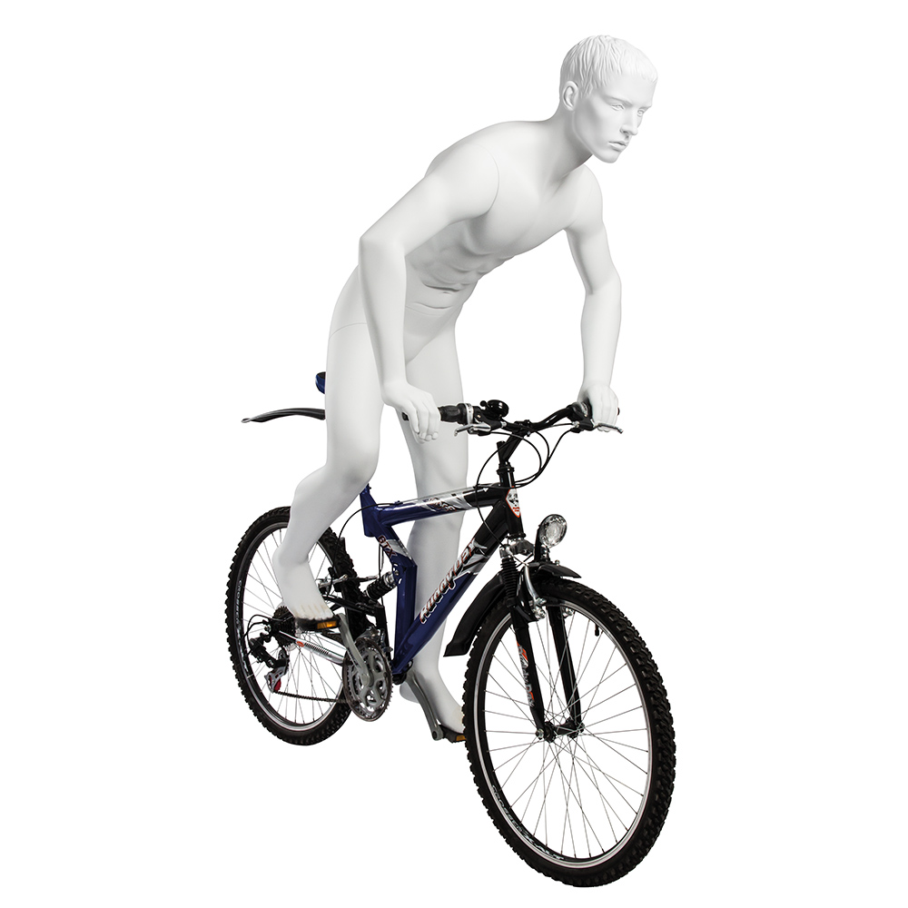 Αθλητική κούκλα βιτρίνας της σειράς Kevin σε στάση ποδηλάτη. To κεφάλι είναι ρεαλιστικό με ανάγλυφο μαλλί (με λεπτομέρειες προσώπου) και κοιτάει ευθεία, χέρια στο τιμόνι και πόδια στα πεντάλ (στάση ποδηλάτη). Είναι κατασκευασμένη από Fiberglass (λεπτές ίνες γυαλιού) ένα υλικό με μεγάλη αντοχή και μικρό βάρος.