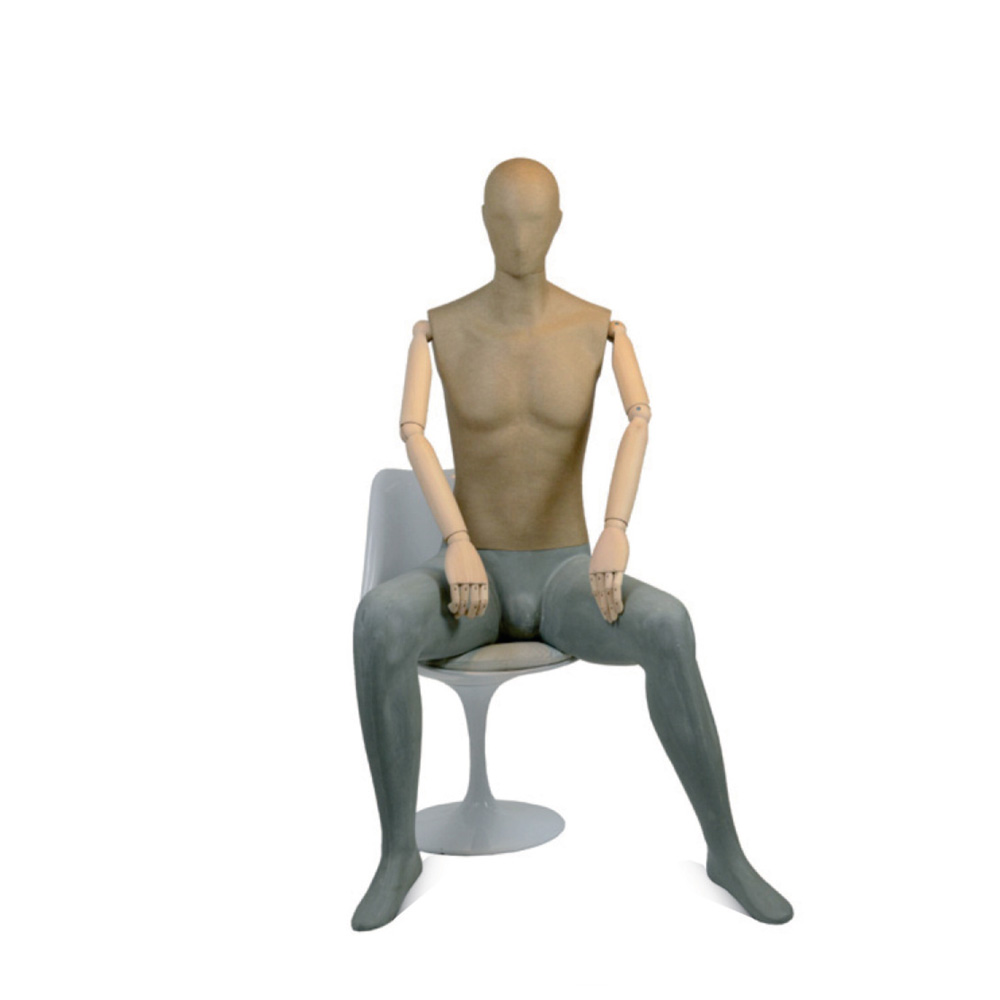 Vintage Ανδρική κούκλα βιτρίνας καθιστή με αφαιρετικό κεφάλι. Το κεφάλι και το σώμα είναι κατασκευασμένα από πλαστικό με επικάλυψη από Papier-mâché, ξύλινα χέρια και πόδια από πλαστικό με όψη τσιμέντου.