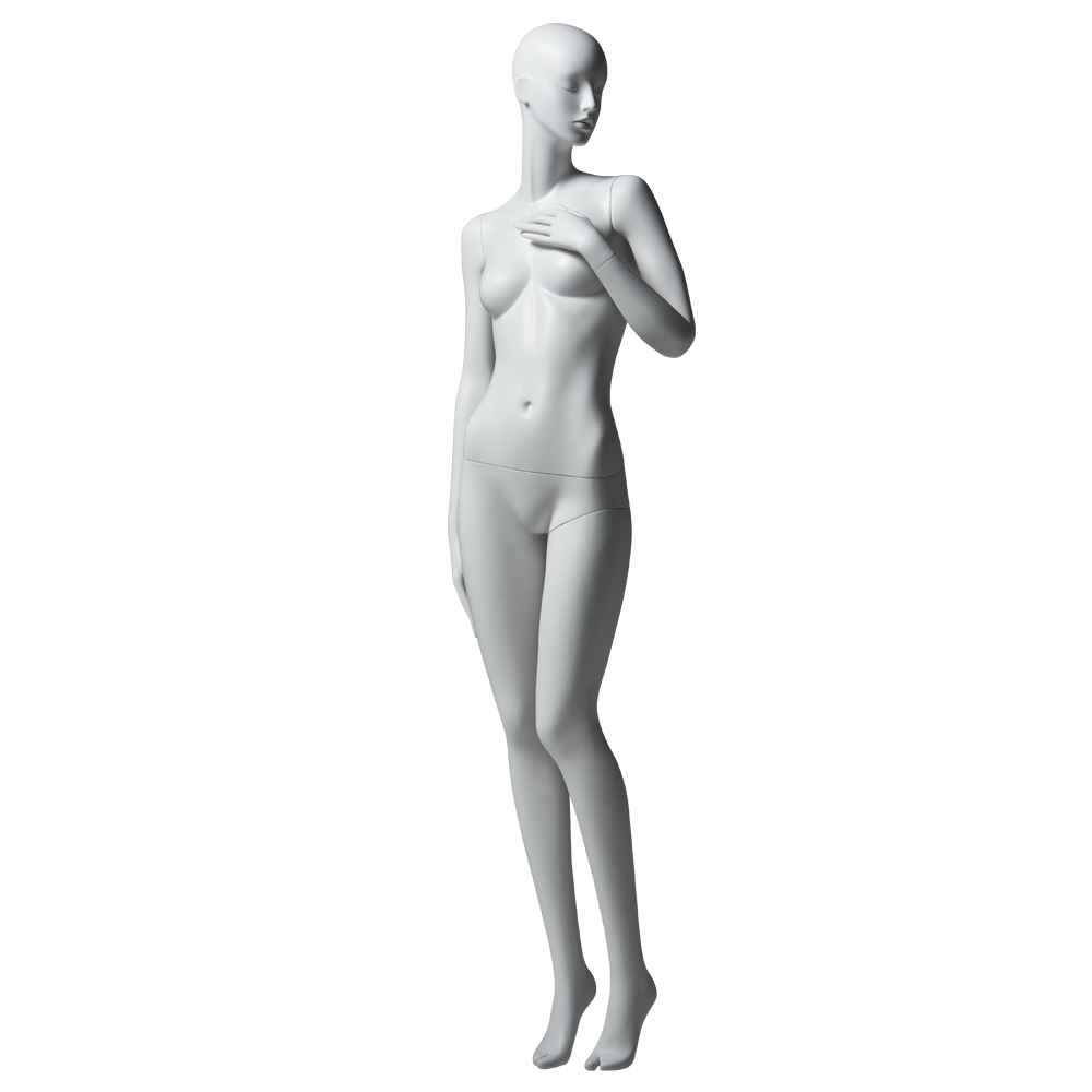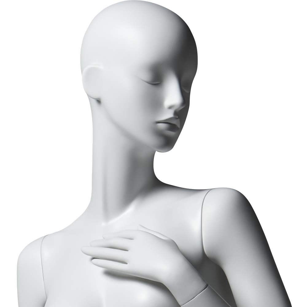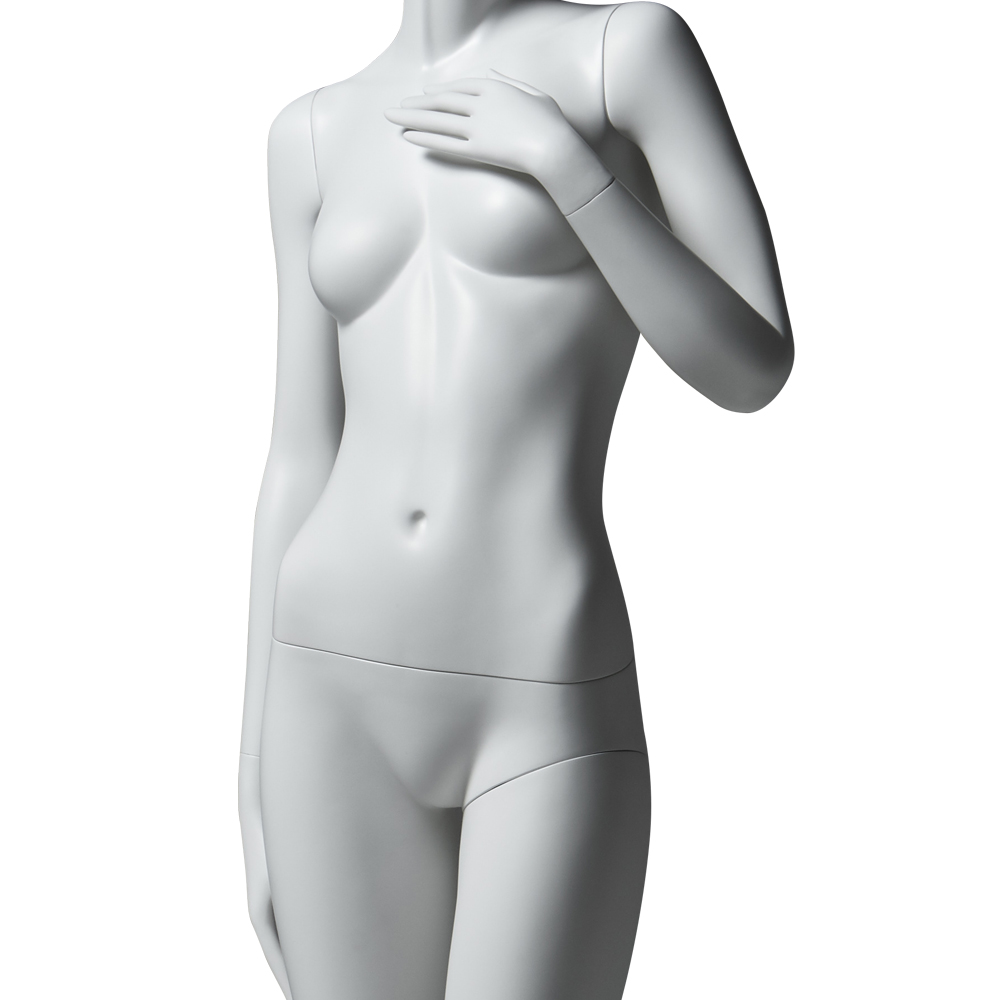Κούκλα βιτρίνας άμορφη της σειράς Asja σε όρθια στάση με το αριστερό χέρι στο θώρακα και το δεξί κάτω αριστερό πόδι ελαφρώς λυγισμένο, πατούσες στις μύτες. Το κεφάλι είναι αφαιρετικό - στυλιζαρισμένο (χωρίς πολλά χαρακτηριστικά προσώπου) και κοιτάζει αριστερά. Είναι κατασκευασμένη από Bioresin (οικολογικό υλικό που προέρχεται από οργανικές πρώτες ύλες).
