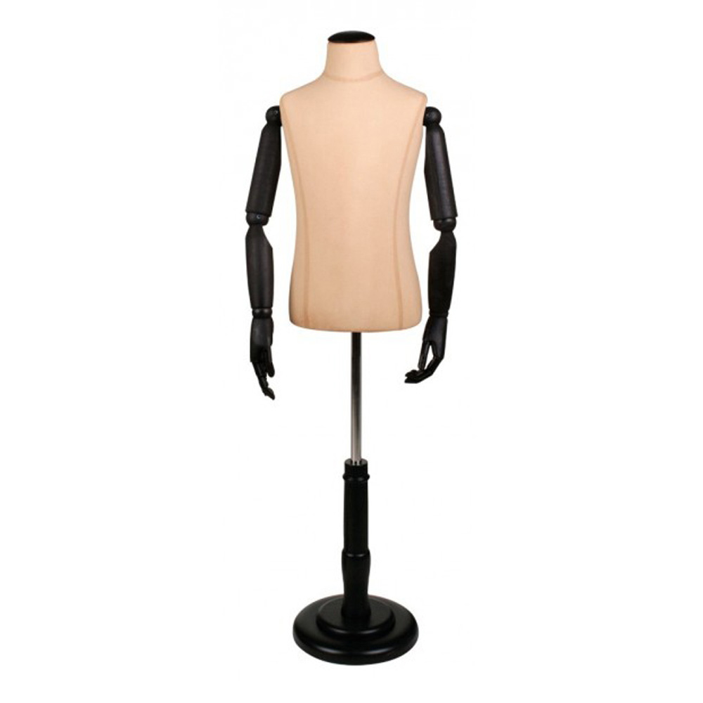 Vintage Παιδικό μπούστο ραπτικής 6-8 Ετών με παλαιωμένο ύφασμα, ξύλινο καπάκι λαιμού, ξύλινα χέρια και τρίποδη ξύλινη βάση. Το μπούστο είναι κατασκευασμένο από πολυουρεθάνη.