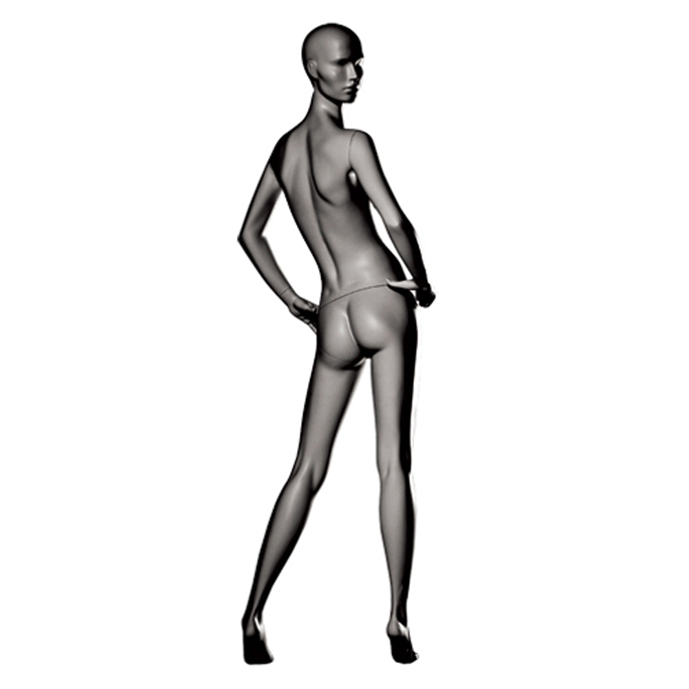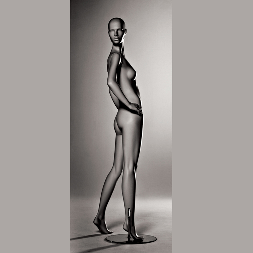 Κούκλα βιτρίνας άμορφη της σειράς Stylized 3 σε όρθια στάση με τα χέρια στη μέση, πατούσες στις μύτες. Το κεφάλι είναι αφαιρετικό - στυλιζαρισμένο (με ελάχιστα χαρακτηριστικά προσώπου) και κοιτάζει δεξιά και πίσω. Οι λεπτομέρειες στα δάχτυλα χεριών και ποδιών είναι ρεαλιστικές. Είναι κατασκευασμένη από Fiberglass (λεπτές ίνες γυαλιού - ένα υλικό με μεγάλη αντοχή και μικρό βάρος).