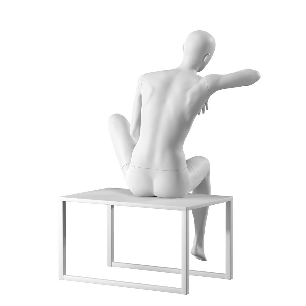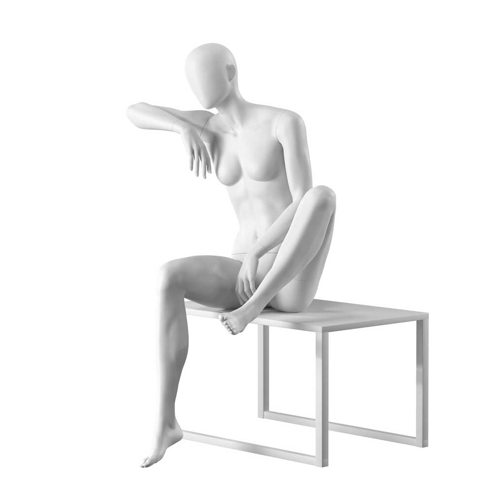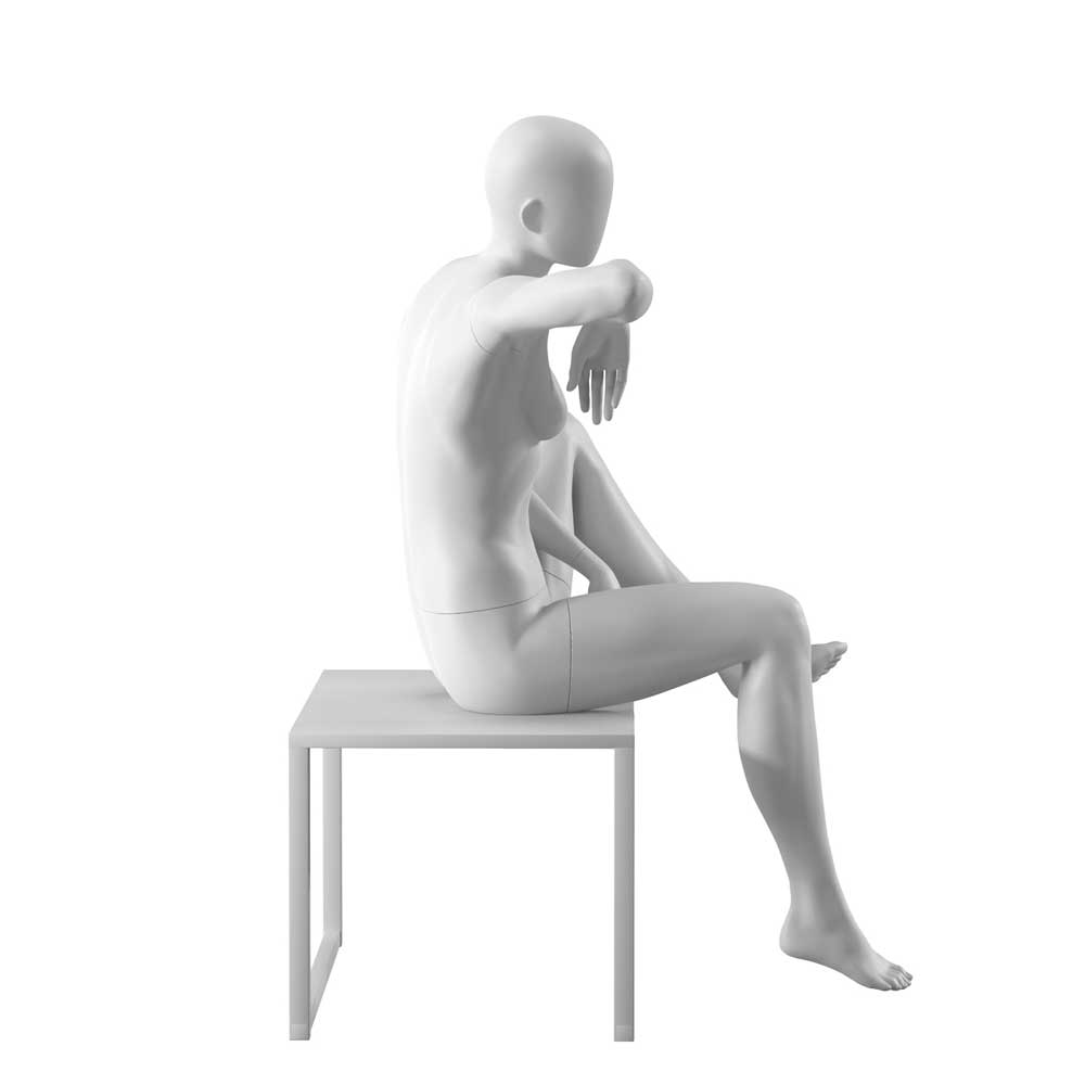 Κούκλα βιτρίνας αφαιρετική της σειράς Urban Collection σε καθιστή στάση. Με αυγοειδές κεφάλι χωρίς χαρακτηριστικά προσώπου. Δάχτυλα χεριών και ποδιών είναι ρεαλιστικά. Είναι κατασκευασμένη από Bio Fiberglass (FRP) ανθεκτικό σε γρατζουνιές, με μεγάλη αντοχή και μικρό βάρος.
