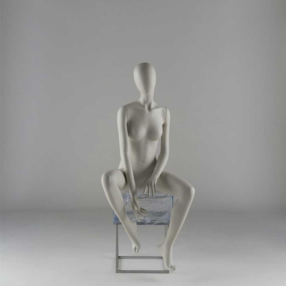 Αφαιρετική Γυναικεία Κούκλα βιτρίνας της σειράς K Abstract σε καθιστή στάση χωρίς χαρακτηριστικά. Είναι κατασκευασμένη από ανακυκλωμένο και ανακυκλώσιμο Fiberglass ανθεκτικό σε γρατζουνιές, με μεγάλη αντοχή και μικρό βάρος.