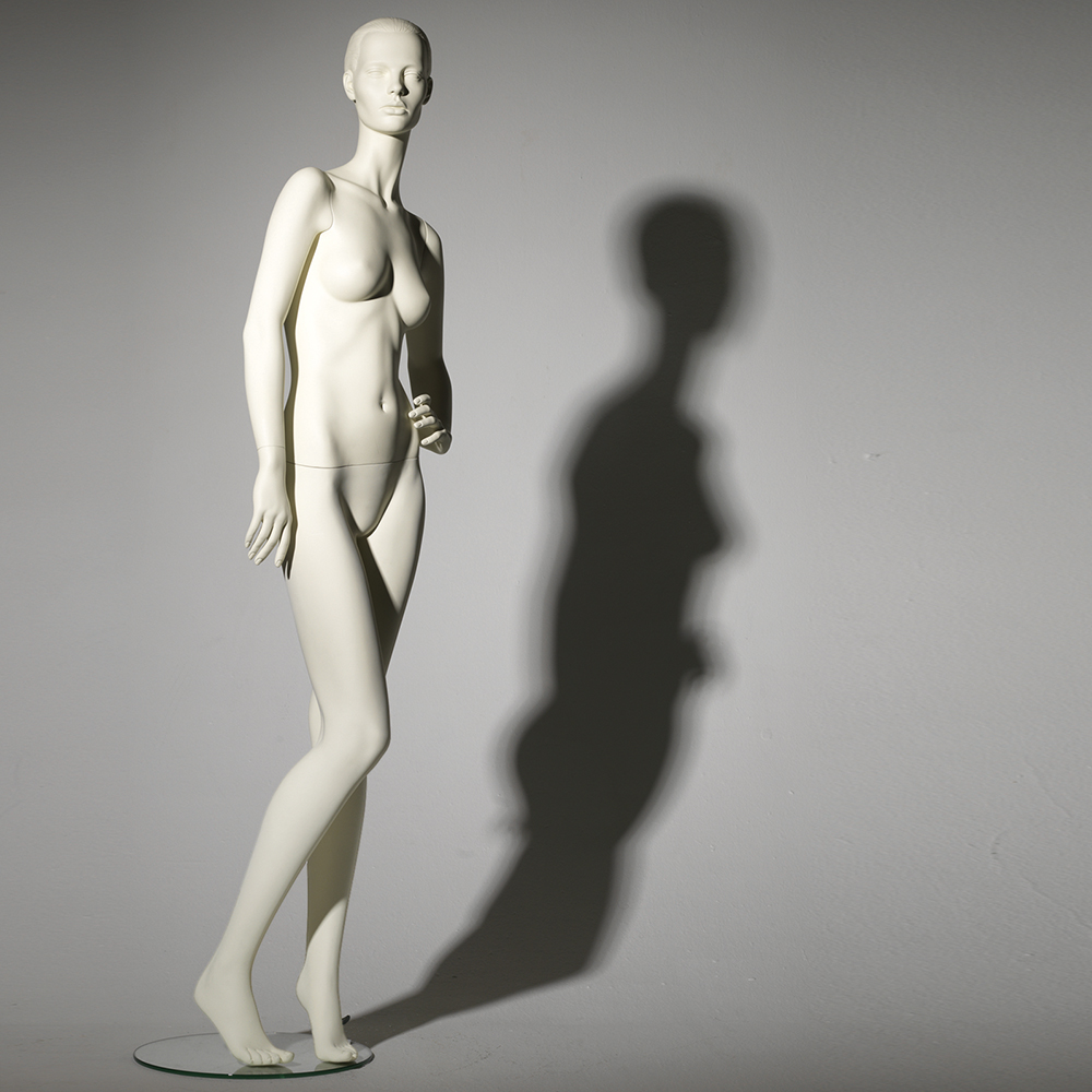 Κούκλα βιτρίνας με ανάγλυφο κεφάλι της σειράς Sharon σε όρθια στάση φεξί χέρι κάτω και αριστερό στη μέση, δεξί πόδι λυγισμένο ελαφρώς, πατούσες στις μύτες. Το κεφάλι είναι ανάγλυφο (με ανάγλυφο μαλλί, χαρακτηριστικά προσώπου χωρίς makeup) και κοιτάζει μπροστά. Οι λεπτομέρειες στα δάχτυλα χεριών και ποδιών είναι ρεαλιστικές. Είναι κατασκευασμένη από Fiberglass (λεπτές ίνες γυαλιού - ένα υλικό με μεγάλη αντοχή και μικρό βάρος).