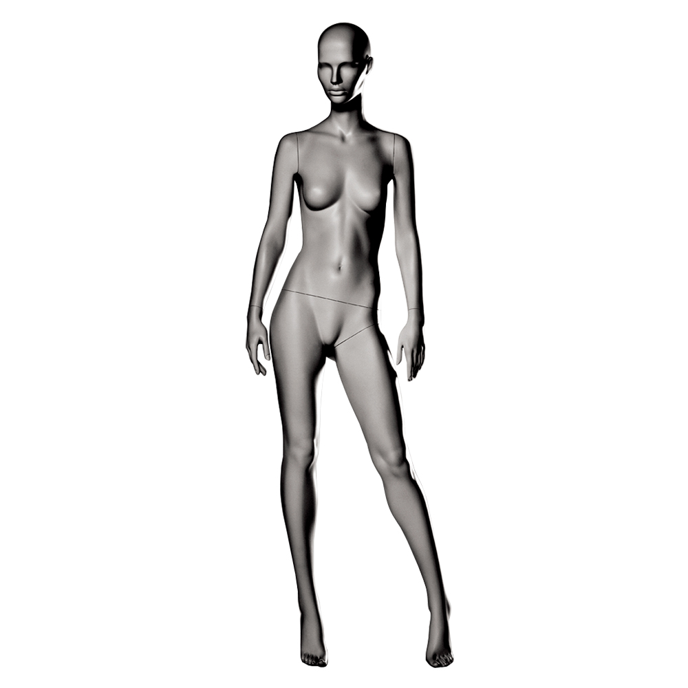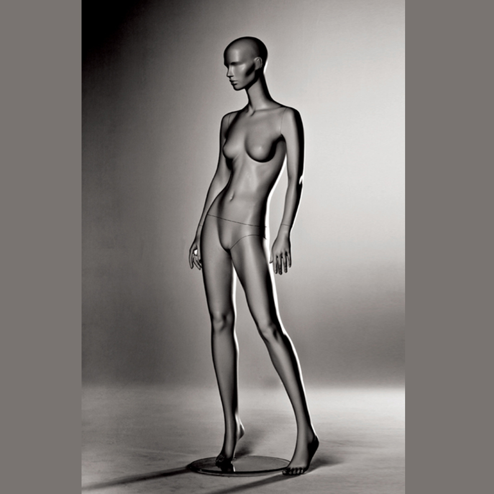 Κούκλα βιτρίνας άμορφη της σειράς Stylized 3 σε όρθια στάση, με τα χέρια κάτω, μικρή κλίση γοφού και πατούσες στις μύτες. Το κεφάλι είναι αφαιρετικό - στυλιζαρισμένο (με ελάχιστα χαρακτηριστικά προσώπου) και κοιτάζει μπροστά. Οι λεπτομέρειες στα δάχτυλα χεριών και ποδιών είναι ρεαλιστικές. Είναι κατασκευασμένη από Fiberglass (λεπτές ίνες γυαλιού - ένα υλικό με μεγάλη αντοχή και μικρό βάρος).