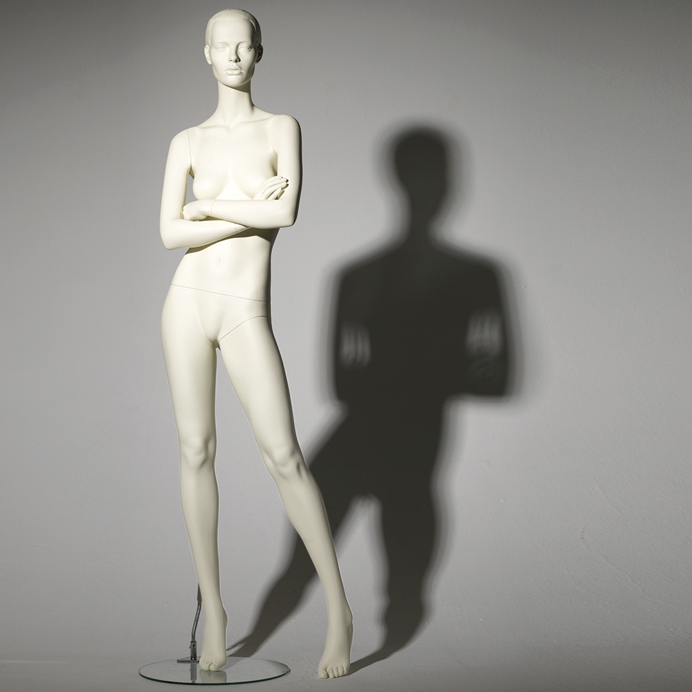 Κούκλα βιτρίνας με ανάγλυφο κεφάλι της σειράς Sharon σε όρθια στάση, με τα χέρια σταυρωμένα, μικρή κλίση γοφού και πατούσες στις μύτες. Το κεφάλι είναι ανάγλυφο (με ανάγλυφο μαλλί, χαρακτηριστικά προσώπου χωρίς makeup) και κοιτάζει μπροστά. Οι λεπτομέρειες στα δάχτυλα χεριών και ποδιών είναι ρεαλιστικές. Είναι κατασκευασμένη από Fiberglass (λεπτές ίνες γυαλιού - ένα υλικό με μεγάλη αντοχή και μικρό βάρος).