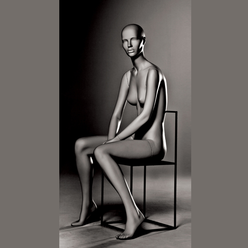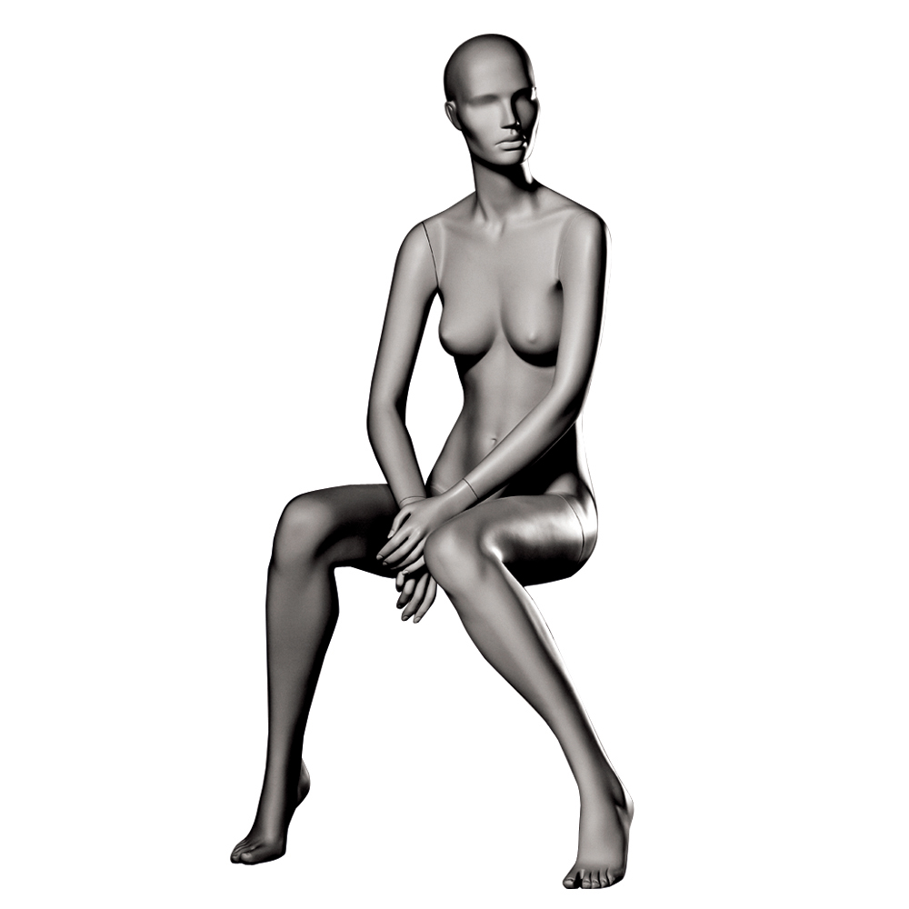Κούκλα βιτρίνας άμορφη της σειράς Stylized 3 σε καθιστή στάση, τα χέρια ανάμεσα στους μηρούς, τα πόδια προς τα έξω, πατούσες στις μύτες. Το κεφάλι είναι αφαιρετικό - στυλιζαρισμένο (με ελάχιστα χαρακτηριστικά προσώπου) και κοιτάζει αριστερά. Οι λεπτομέρειες στα δάχτυλα χεριών και ποδιών είναι ρεαλιστικές. Είναι κατασκευασμένη από Fiberglass (λεπτές ίνες γυαλιού - ένα υλικό με μεγάλη αντοχή και μικρό βάρος).