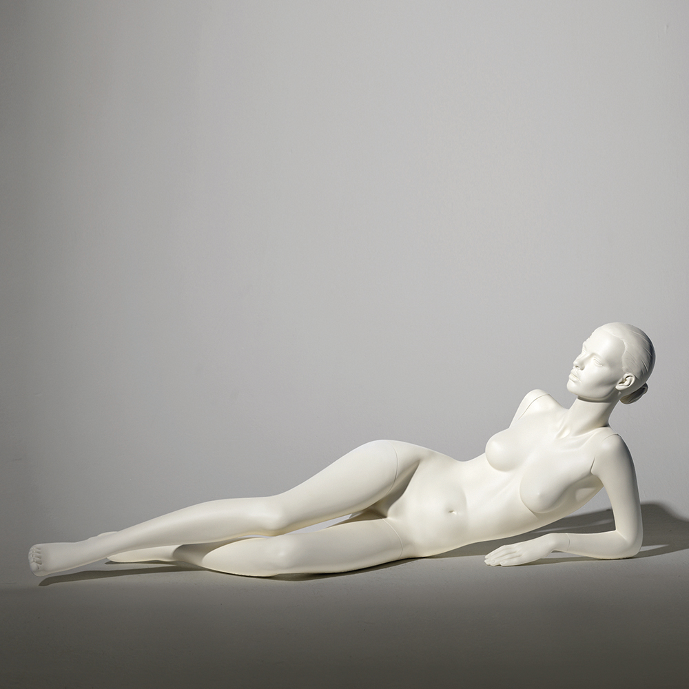 Κούκλα βιτρίνας με ανάγλυφο κεφάλι της σειράς Sharon σε ξαπλωτή στάση, τα χέρια με τους αγκώνες να ακουμπόυν στο έδαφος αριστερός μηρός στο έδαφος και αριστερό γόνατο λυγισμένο, πατούσες στις μύτες. Το κεφάλι είναι ανάγλυφο (με ανάγλυφο μαλλί, χαρακτηριστικά προσώπου χωρίς makeup) και κοιτάζει ευθεία. Οι λεπτομέρειες στα δάχτυλα χεριών και ποδιών είναι ρεαλιστικές. Είναι κατασκευασμένη από Fiberglass (λεπτές ίνες γυαλιού - ένα υλικό με μεγάλη αντοχή και μικρό βάρος).