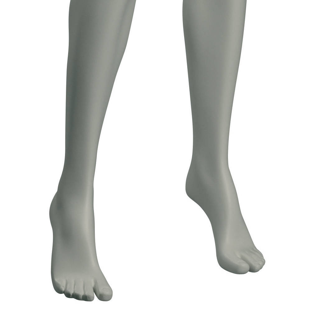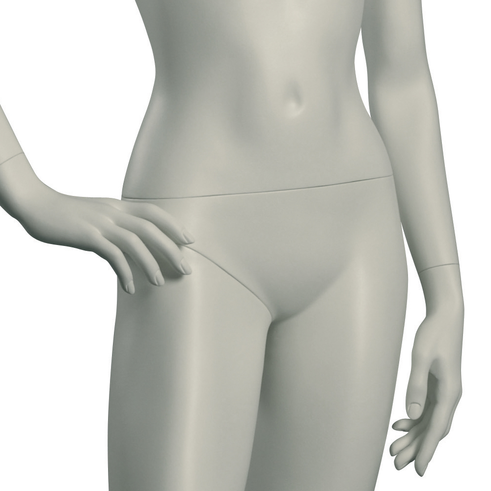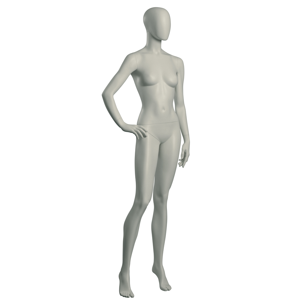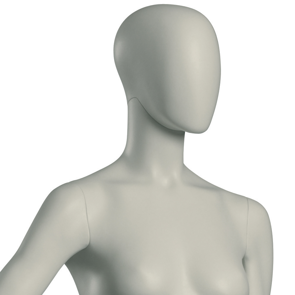 Κούκλα βιτρίνας άμορφη της σειράς Stylized 2 σε όρθια στάση, με το δεξί χέρι στη μέση και το αριστερό κάτω στις μύτες. Το κεφάλι είναι αφαιρετικό - αυγοειδές (χωρίς καθόλου χαρακτηριστικά προσώπου) και κοιτάζει μπροστά. Οι λεπτομέρειες στα δάχτυλα χεριών και ποδιών είναι ρεαλιστικές. Είναι κατασκευασμένη από Fiberglass (λεπτές ίνες γυαλιού - ένα υλικό με μεγάλη αντοχή και μικρό βάρος).