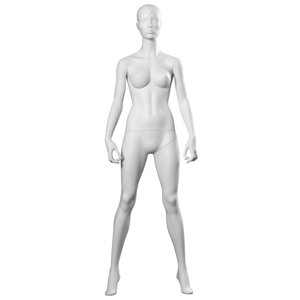 Κούκλα βιτρίνας της σειράς Prêt-à-Porter σε ίσια όρθια στάση, το κεφάλι κοιτάει ευθεία, τα χέρια κάτω με δάχτυλα κλειστά, πόδια σε μικρή διάσταση και πατούσες στις μύτες. Δάχτυλα χεριών και ποδιών στυλιζαρισμένα. Είναι κατασκευασμένη από Fiberglass (λεπτές ίνες γυαλιού) ένα υλικό με μεγάλη αντοχή και μικρό βάρος.