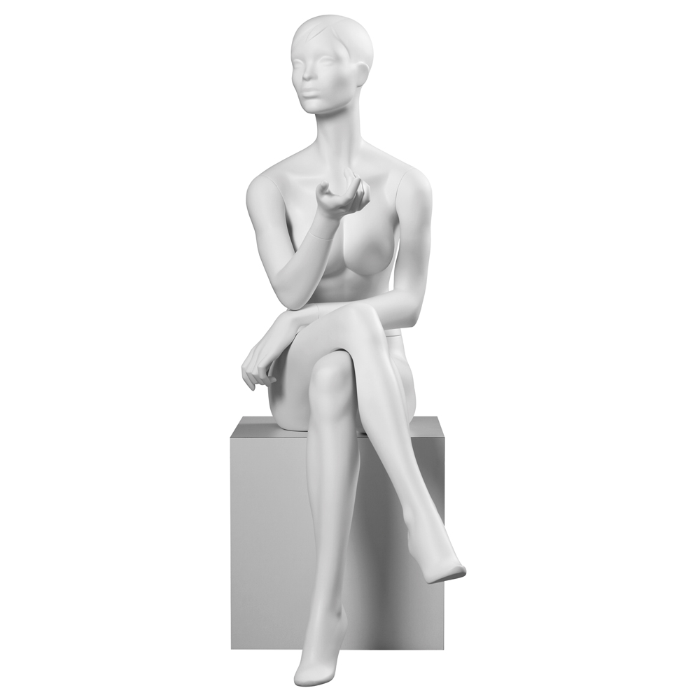 Κούκλα βιτρίνας της σειράς Prêt-à-Porter σε καθιστή στάση, το κεφάλι κοιτάει ελαφρώς δεξιά, αριστερό χέρι ακουμπάει στον αριστερό μηρό, δεξής αγκώνας λυγισμένος, με λυγισμένα δάχτυλα, δεξί πόδι πάνω από το αριστερό (σταυροπόδι) και πατούσες στις μύτες. Δάχτυλα χεριών και ποδιών στυλιζαρισμένα. Είναι κατασκευασμένη από Fiberglass (λεπτές ίνες γυαλιού) ένα υλικό με μεγάλη αντοχή και μικρό βάρος.