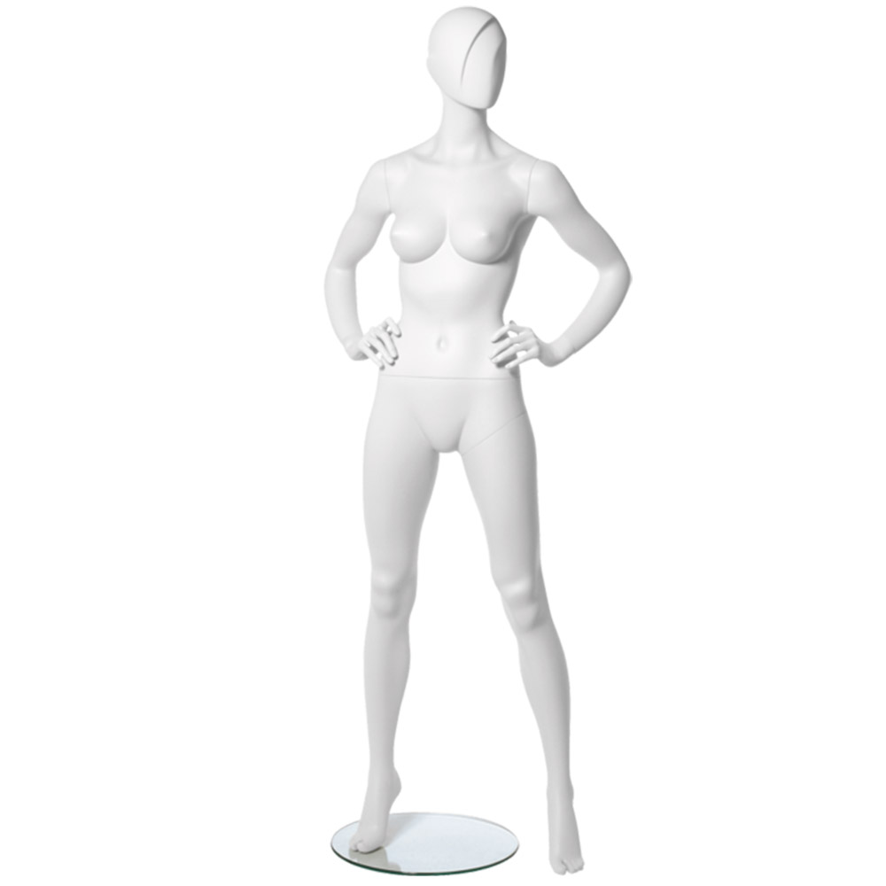 Κούκλα βιτρίνας της σειράς Chelsea Girls Abstract Collection σε ίσια όρθια στάση. To κεφάλι είναι αυγοειδές (χωρίς καθόλου χαρακτηριστικά προσώπου) και κοιτάει αριστερά, χέρια στη μέση, πόδια σε μικρή διάσταση, πατούσες στις μύτες. Δάχτυλα χεριών και ποδιών είναι ρεαλιστικά. Είναι κατασκευασμένη από Fiberglass (λεπτές ίνες γυαλιού) ένα υλικό με μεγάλη αντοχή και μικρό βάρος.