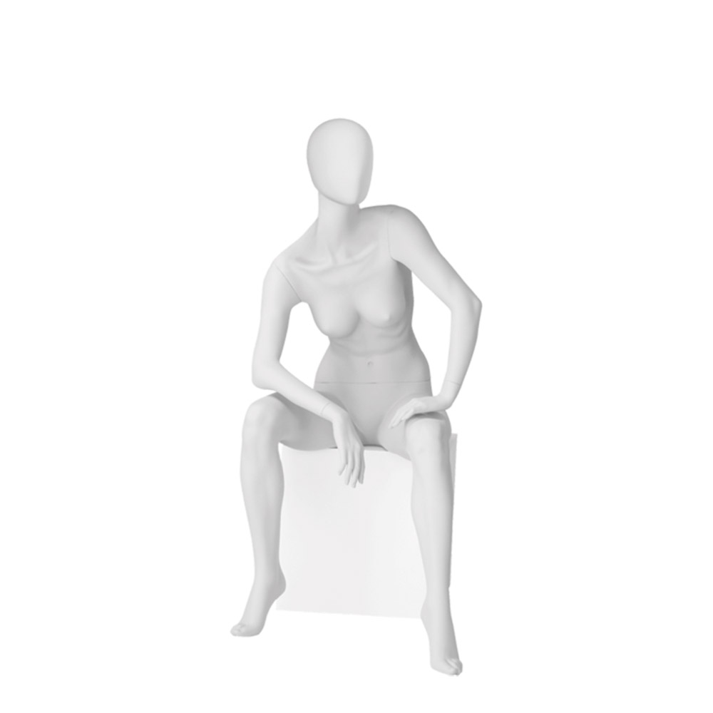 Κούκλα βιτρίνας της σειράς Uptown Girls Abstract Collection σε καθιστή στάση. To κεφάλι είναι αυγοειδές (χωρίς καθόλου χαρακτηριστικά προσώπου) και κοιτάει αριστερά, ταριστερό χέρι πάνω στον αριστερό μηρό, και δεξί αγκώνας ακουμπάει στο δεξί γόνατο, πατούσες στις μύτες. Δάχτυλα χεριών και ποδιών είναι ρεαλιστικά. Είναι κατασκευασμένη από Fiberglass (λεπτές ίνες γυαλιού) ένα υλικό με μεγάλη αντοχή και μικρό βάρος.