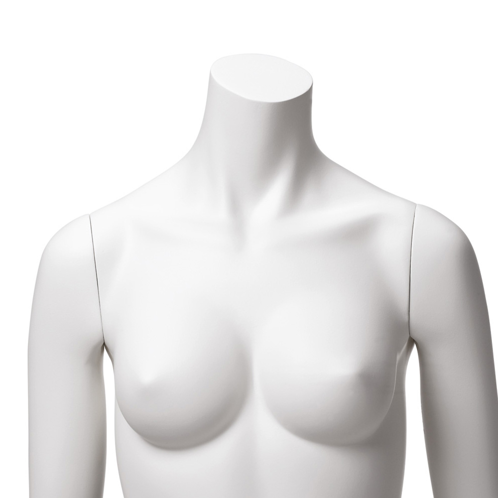 Ακέφαλη κούκλα βιτρίνας της σειράς Adriana σε ίσια όρθια στάση, αριστερό χέρι στον αριστερό γοφό, δεξί γόνατο λυγισμένο, πατούσες στις μύτες. Είναι κατασκευασμένη από Fiberglass (λεπτές ίνες γυαλιού) ένα υλικό με μεγάλη αντοχή και μικρό βάρος.