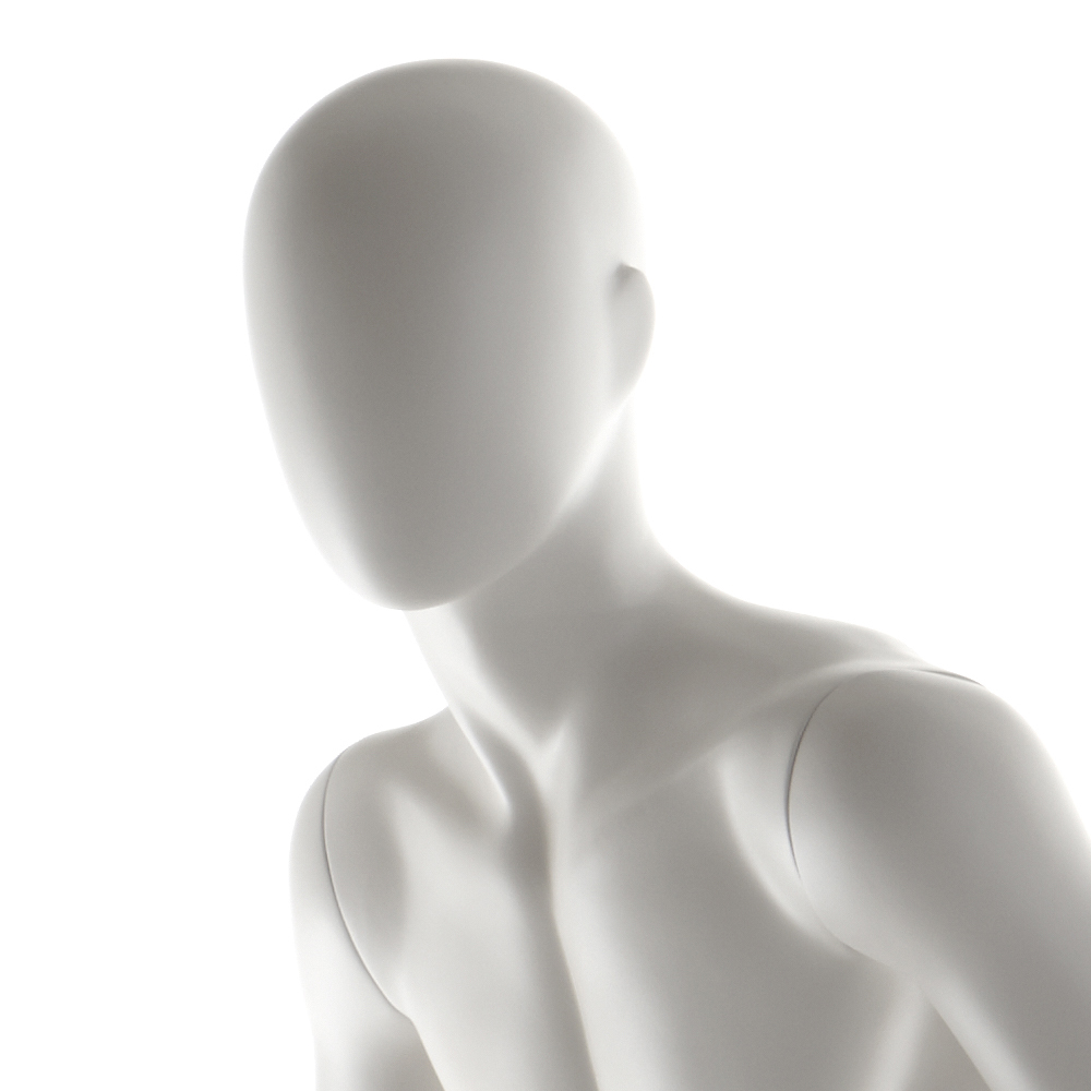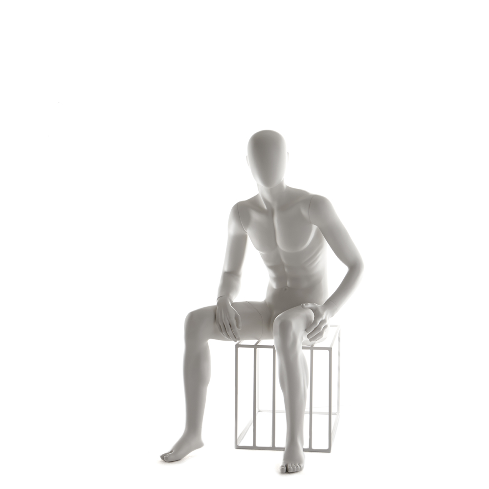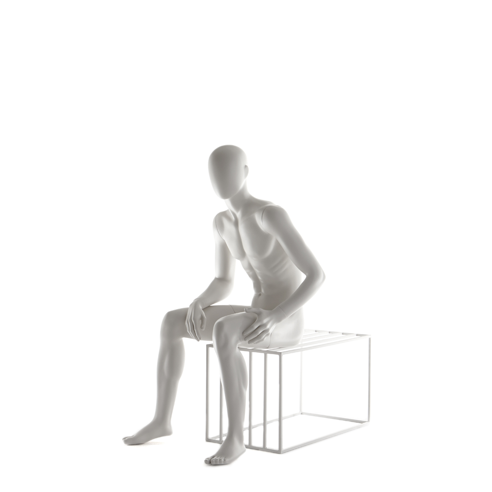 Ανδρική κούκλα βιτρίνας άμορφη της σειράς Stylized Zero σε καθιστή στάση, δεξί χέρι ακουμπάει στο δεξιό μηρό και αριστερό χέρι πιάνει έξω από τον αριστερό μηρό. Το κεφάλι είναι αφαιρετικό - αυγοειδές (χωρίς καθόλου χαρακτηριστικά προσώπου) και κοιτάζει ευθεία. Οι λεπτομέρειες στα δάχτυλα χεριών και ποδιών είναι ρεαλιστικές. Είναι κατασκευασμένη από Fiberglass (λεπτές ίνες γυαλιού - ένα υλικό με μεγάλη αντοχή και μικρό βάρος).