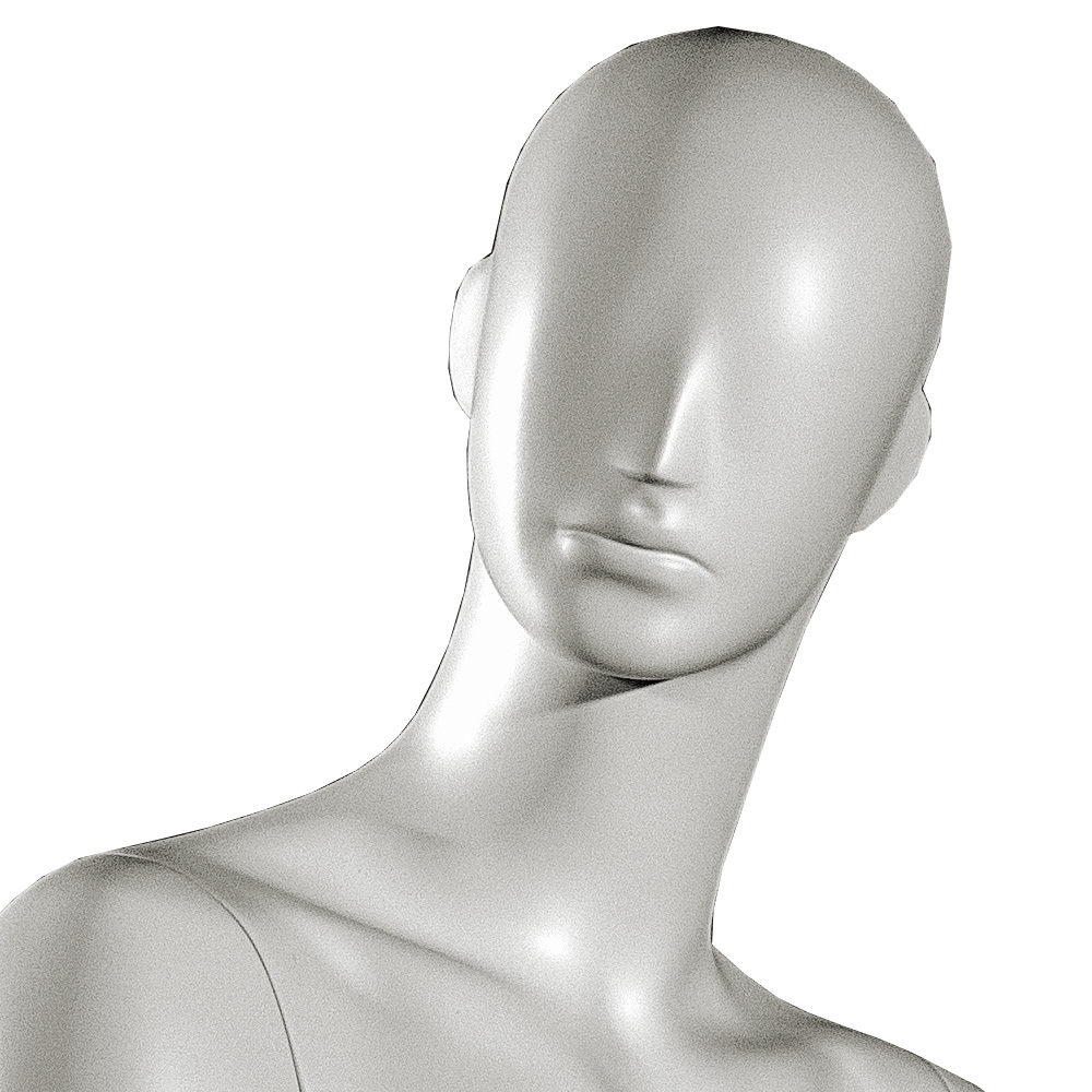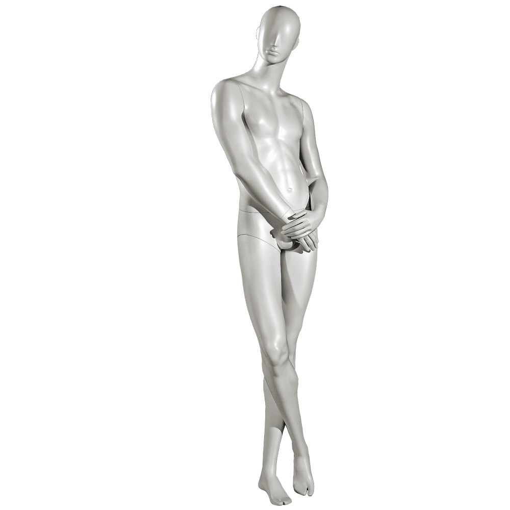 Ανδρική κούκλα βιτρίνας άμορφη της σειράς Ophelia Man σε όρθια στάση. Το κεφάλι είναι αφαιρετικό - στυλιζαρισμένο (χωρίς πολλά χαρακτηριστικά προσώπου) και κοιτάζει δεξιά, τα χέρια μπροστά σταυρωτά, δεξί γόνατο λυγισμένο μπροστά από το αριστερό πόδι (σταυρωτά). Δάχτυλα χεριών και ποδιών είναι στυλιζαρισμένα. Είναι κατασκευασμένη από Fiberglass (λεπτές ίνες γυαλιού) ένα υλικό με μεγάλη αντοχή και μικρό βάρος.