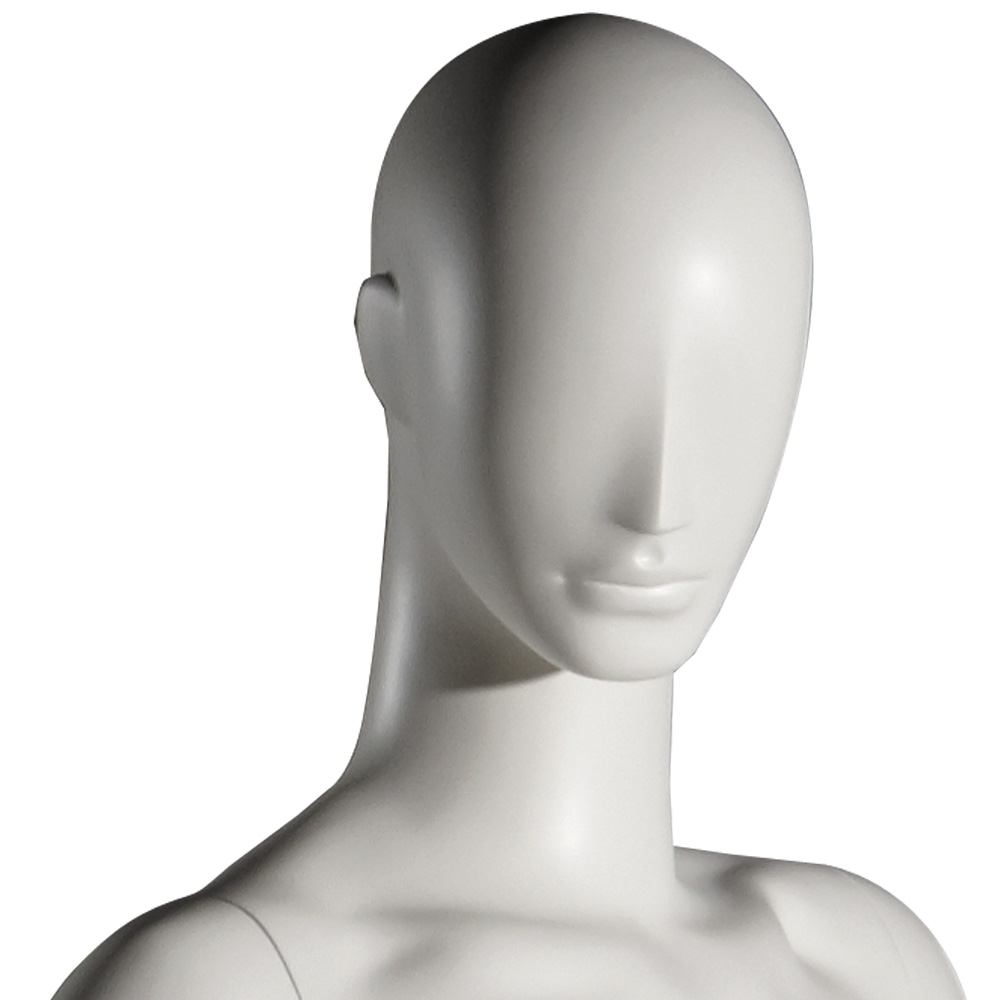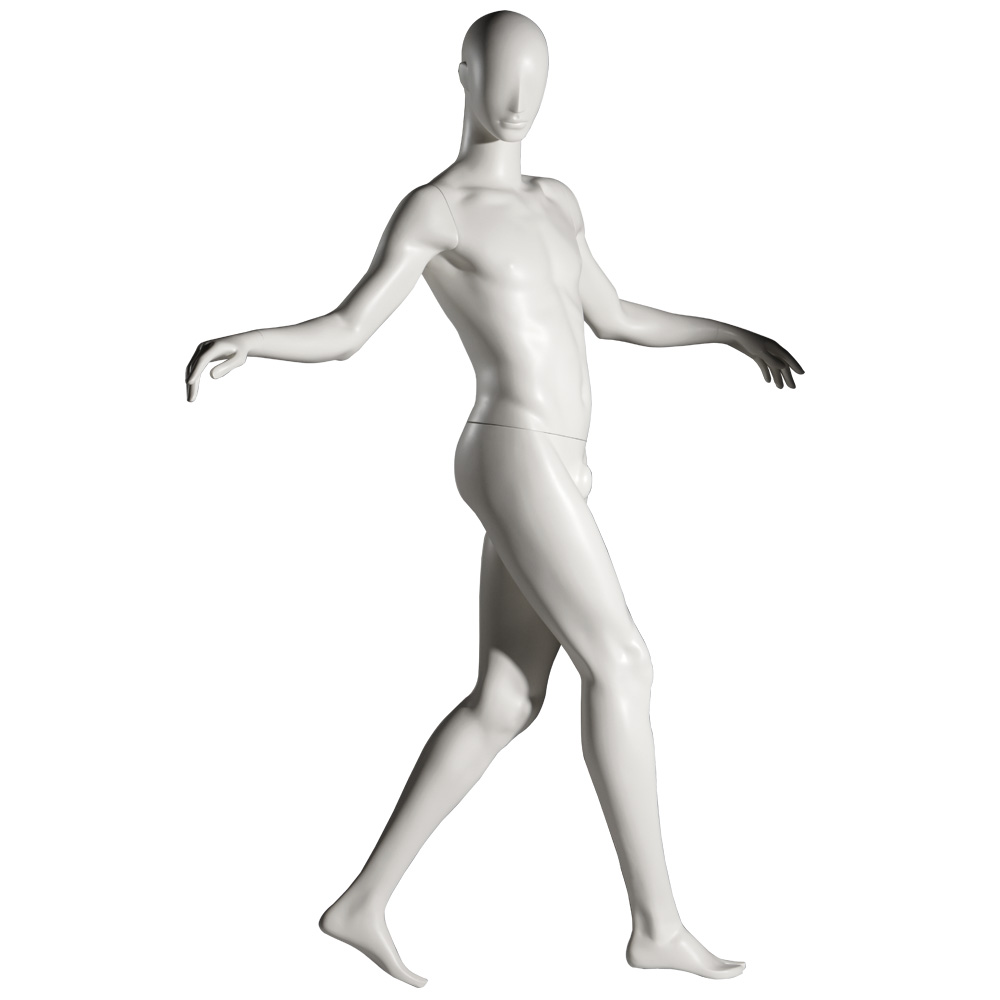 Ανδρική κούκλα βιτρίνας άμορφη της σειράς Ophelia Man σε όρθια στάση. Το κεφάλι είναι αφαιρετικό - στυλιζαρισμένο (χωρίς πολλά χαρακτηριστικά προσώπου) και κοιτάζει αριστερά, χέρια λυγισμένα σε έκταση, δεξί πόδι μπροστά από το αριστερό (στάση περπατήματος). Δάχτυλα χεριών και ποδιών είναι στυλιζαρισμένα. Είναι κατασκευασμένη από Fiberglass (λεπτές ίνες γυαλιού) ένα υλικό με μεγάλη αντοχή και μικρό βάρος.