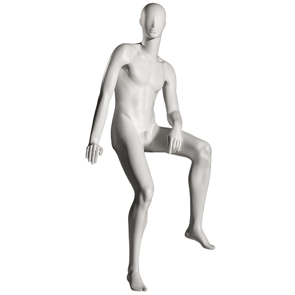 Ανδρική κούκλα βιτρίνας άμορφη της σειράς Ophelia Man σε καθιστή στάση. Το κεφάλι είναι αφαιρετικό - στυλιζαρισμένο (χωρίς πολλά χαρακτηριστικά προσώπου) και κοιτάζει ευθεία, αριστερό χέρι πάνω στον αριστερό μηρό. Δάχτυλα χεριών και ποδιών είναι στυλιζαρισμένα. Είναι κατασκευασμένη από Fiberglass (λεπτές ίνες γυαλιού) ένα υλικό με μεγάλη αντοχή και μικρό βάρος.