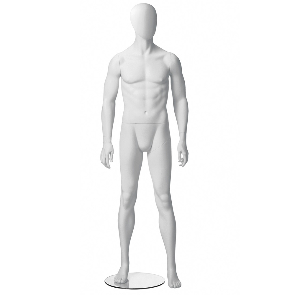 Ανδρική κούκλα βιτρίνας της σειράς Metro Male Collection σε όρθια στάση, με τα χέρια κάτω, πόδια στο άνοιγμα των γοφών. Το κεφάλι είναι αφαιρετικό - αυγοειδές (χωρίς καθόλου χαρακτηριστικά προσώπου) και κοιτάζει ευθεία. Οι λεπτομέρειες στα δάχτυλα χεριών και ποδιών είναι ρεαλιστικές. Είναι κατασκευασμένη από Fiberglass (λεπτές ίνες γυαλιού - ένα υλικό με μεγάλη αντοχή και μικρό βάρος).