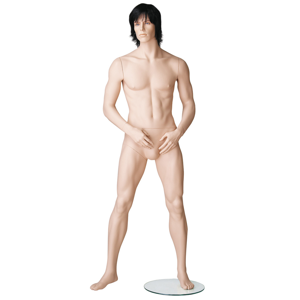 Ανδρική κούκλα βιτρίνας της σειράς Downtown Guys Collection σε όρθια στάση με τους αγκώνες λυγισμένους και τις παλάμες πάνω από τους μηρούς, πόδια σε διάσταση. Το κεφάλι είναι ρεαλιστικό (με ρεαλιστικά χαρακτηριστικά προσώπου) και ανάγλυφο μαλλί και κοιτάζει ελαφρώς αριστερά. Είναι κατασκευασμένη από Fiberglass (λεπτές ίνες γυαλιού) ένα υλικό με μεγάλη αντοχή και μικρό βάρος.